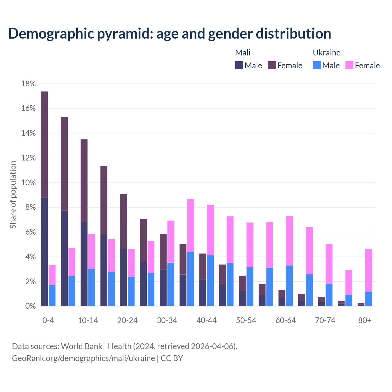 - Mali is ranked 193/196 by median age (oldest to youngest) vs 26/196 for Ukraine.