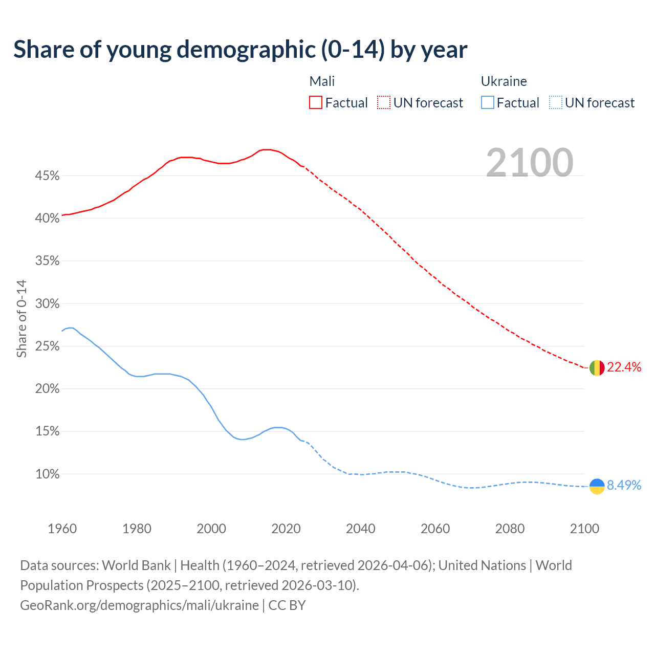 - The share of young demographic (0-15 years old) in Mali is 46.1% vs 13.9% in Ukraine.