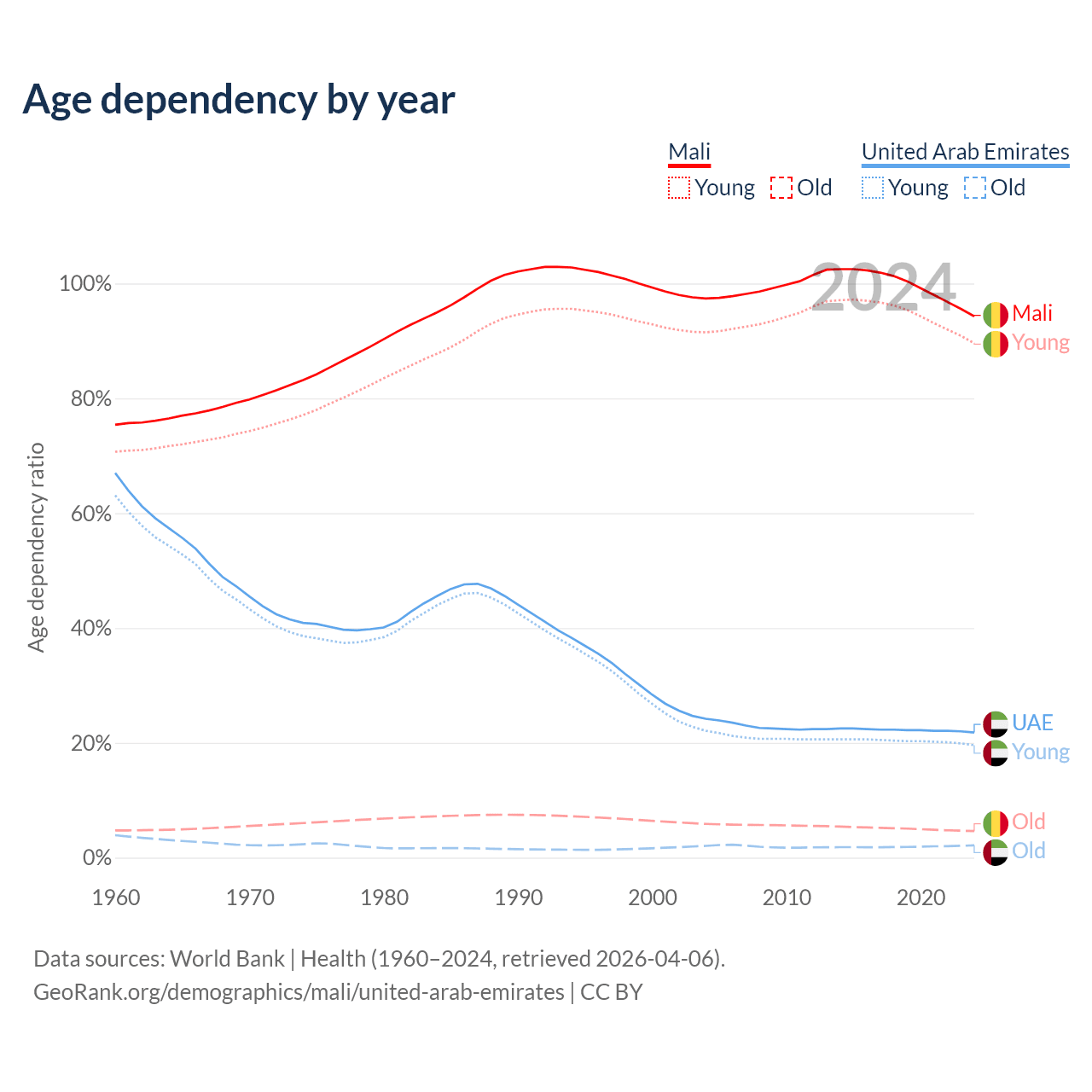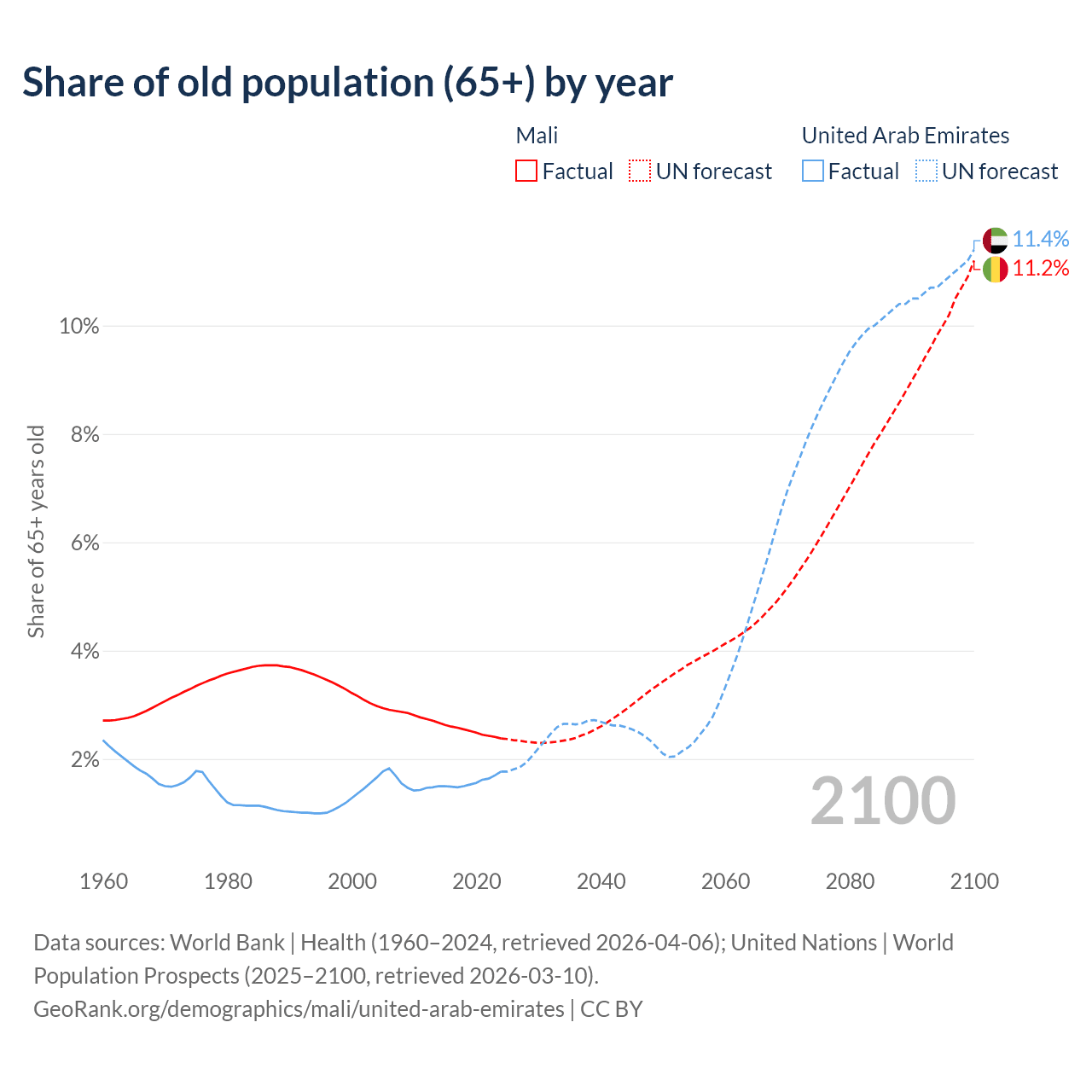 - The share of old-age demographic (65+) in Mali is 2.38% vs 1.77% in the United Arab Emirates.