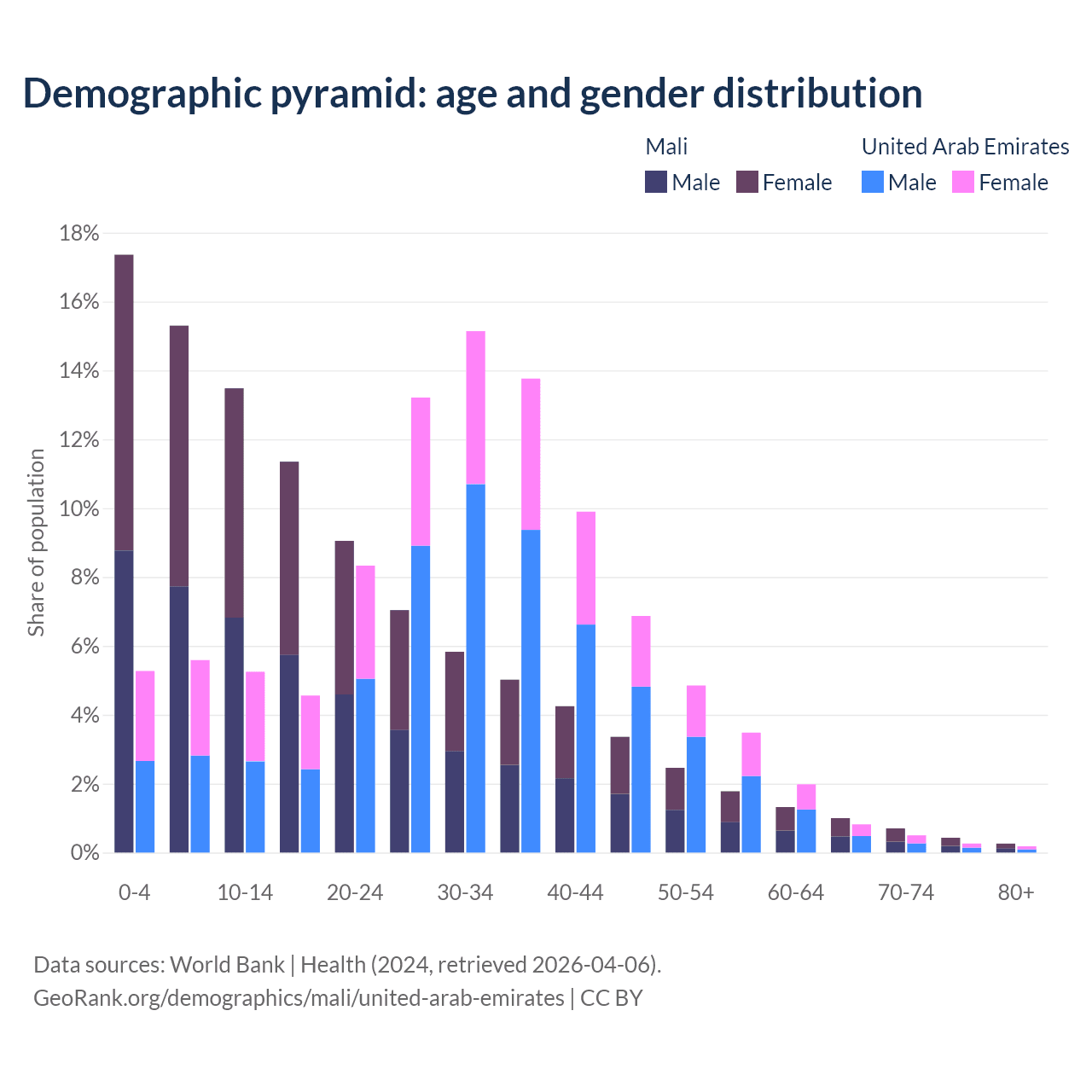- Mali is ranked 193/196 by median age (oldest to youngest) vs 91/196 for the United Arab Emirates.