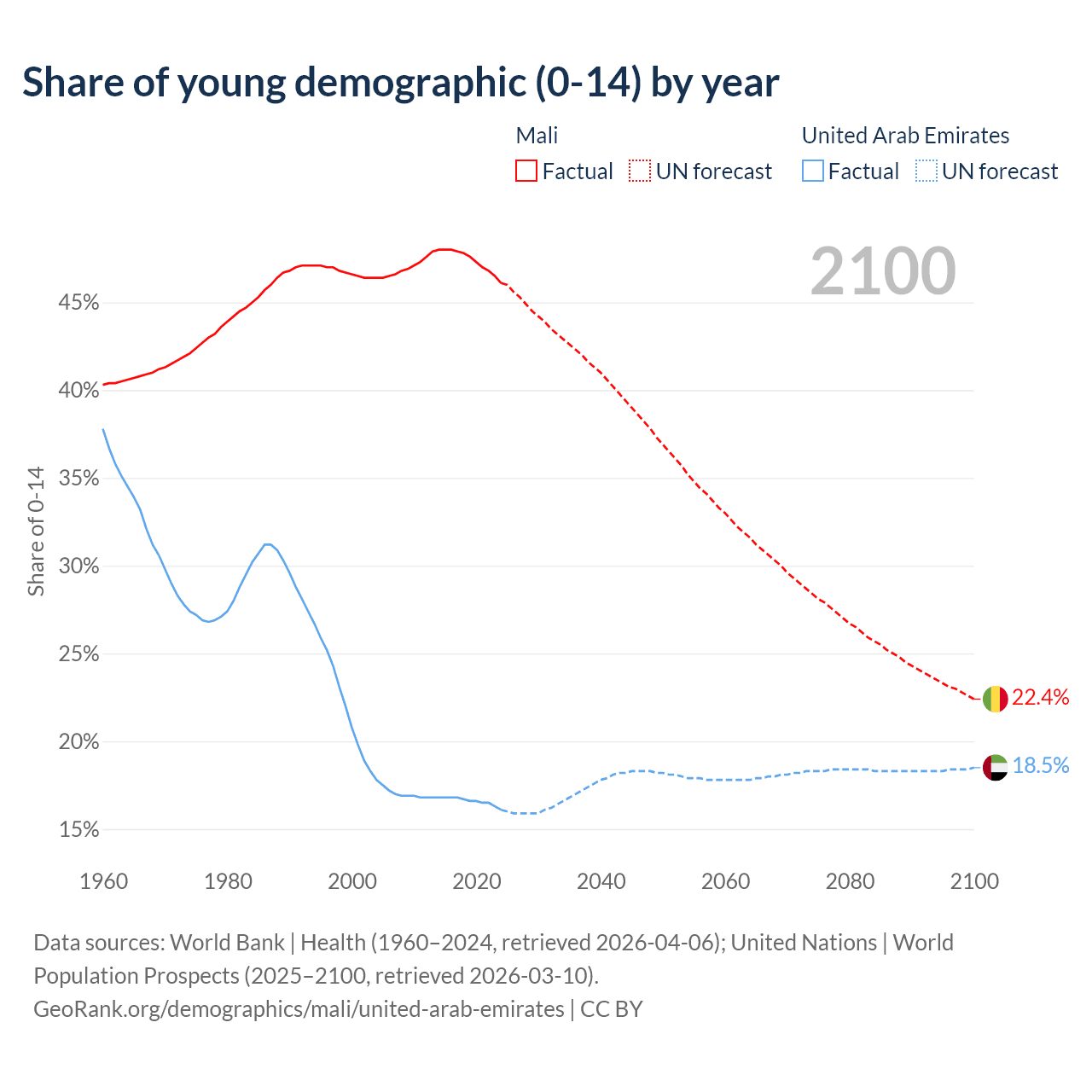 - The share of young demographic (0-15 years old) in Mali is 46.1% vs 16.1% in the United Arab Emirates.