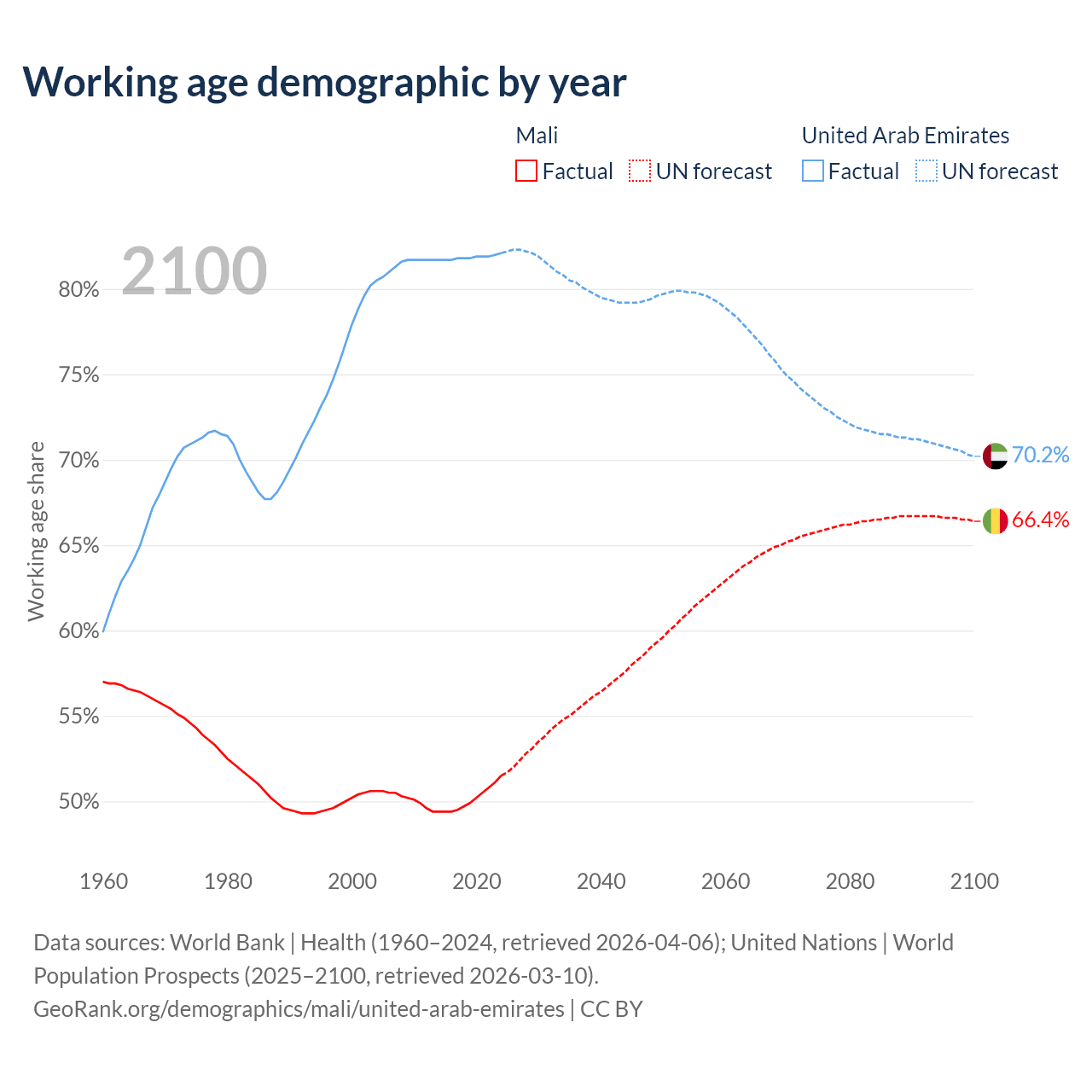 - Mali has 13.5M working age adults (aged 15-64) vs 9.6M in the United Arab Emirates.