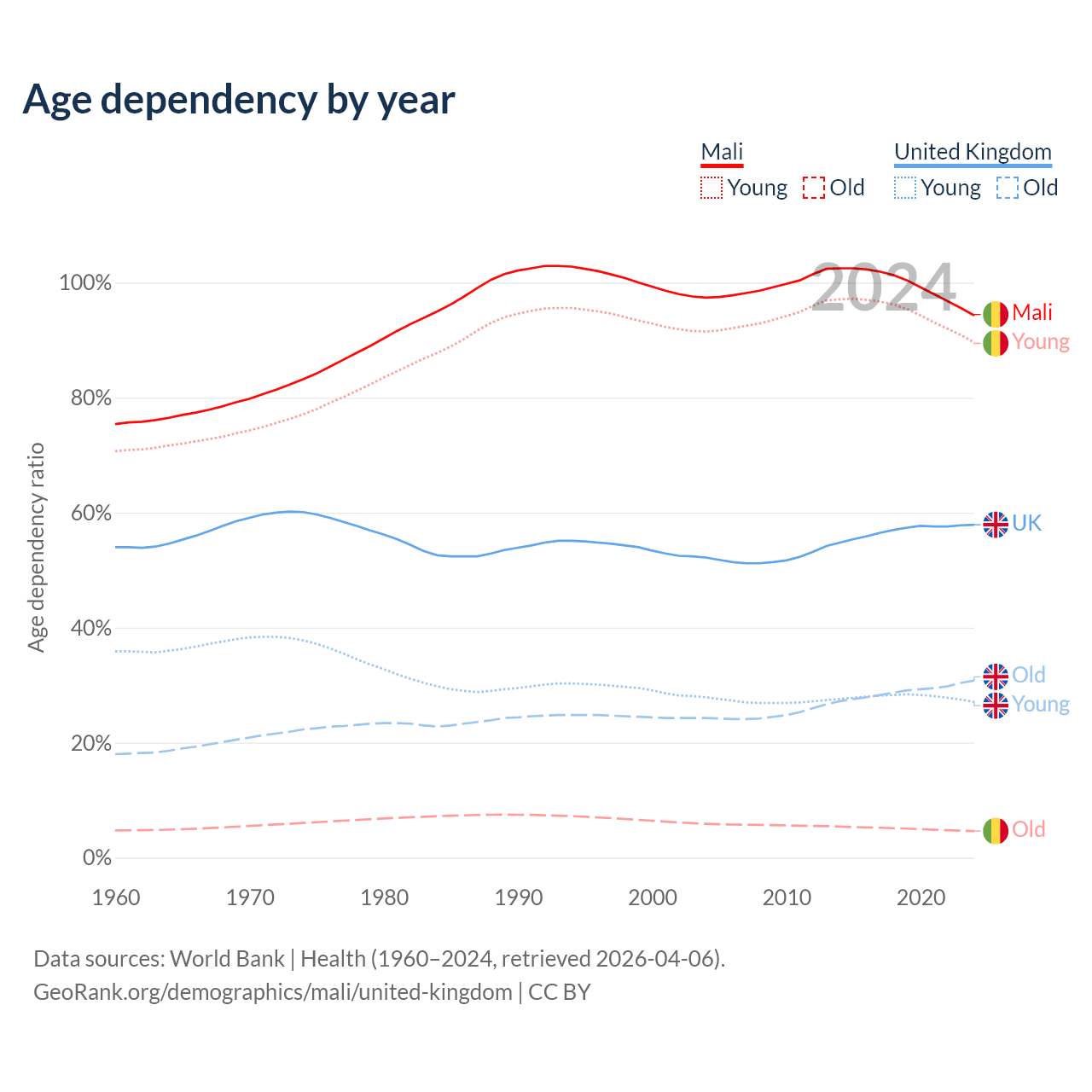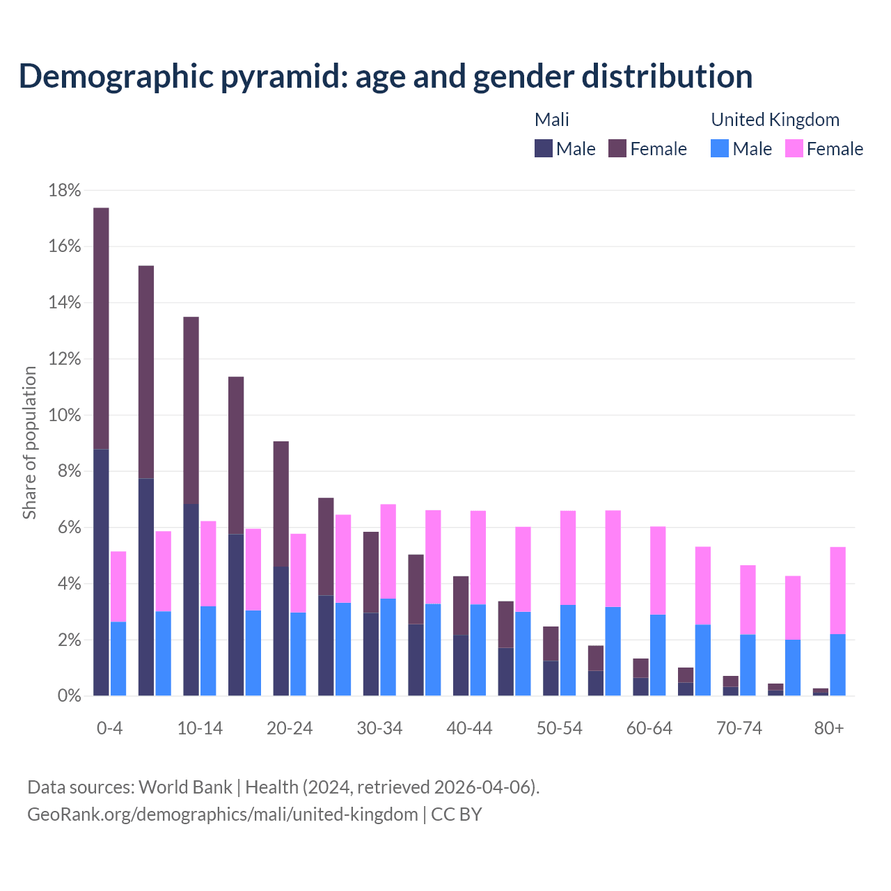 - Mali is ranked 193/196 by median age (oldest to youngest) vs 41/196 for the United Kingdom.