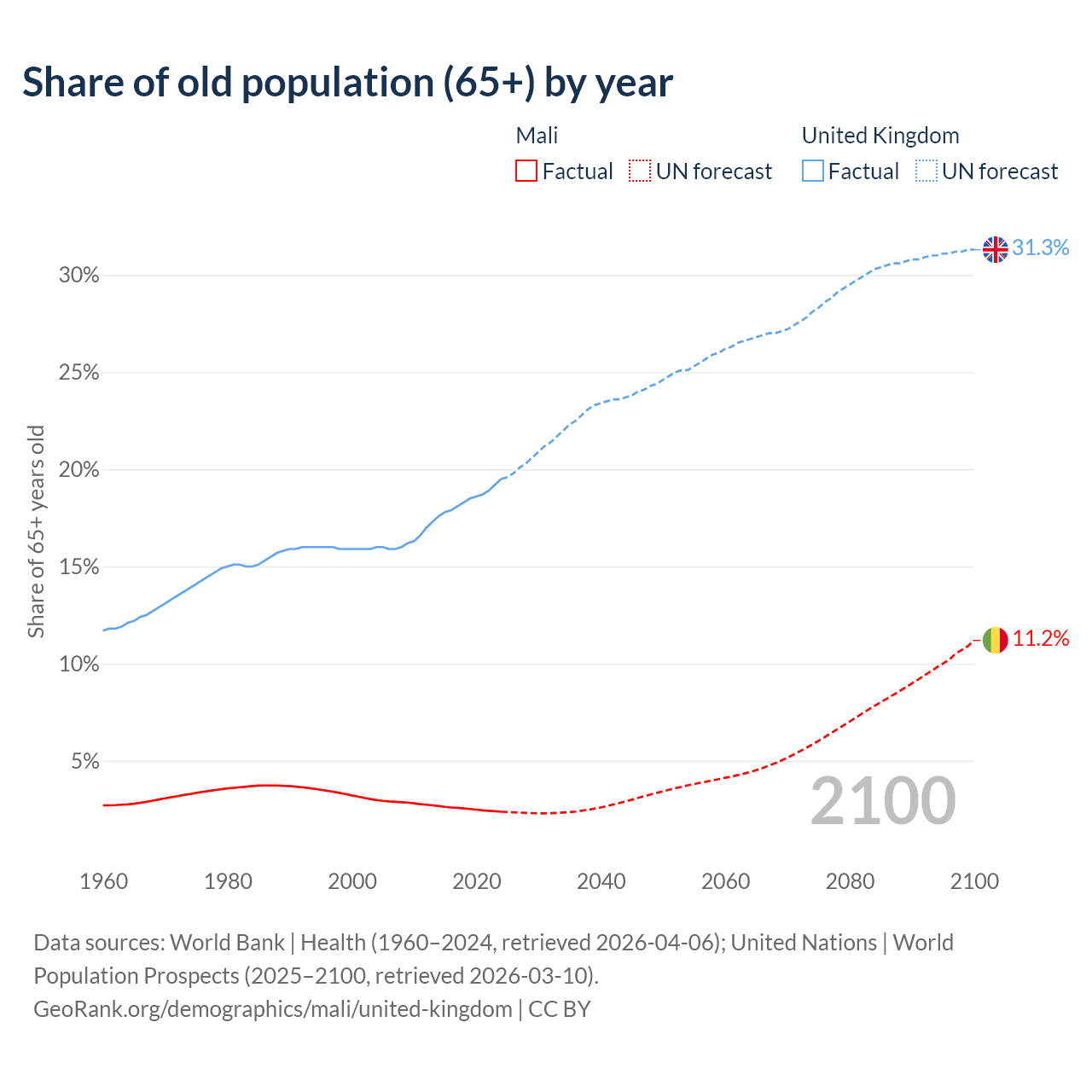 - The share of old-age demographic (65+) in Mali is 2.38% vs 19.5% in the United Kingdom.