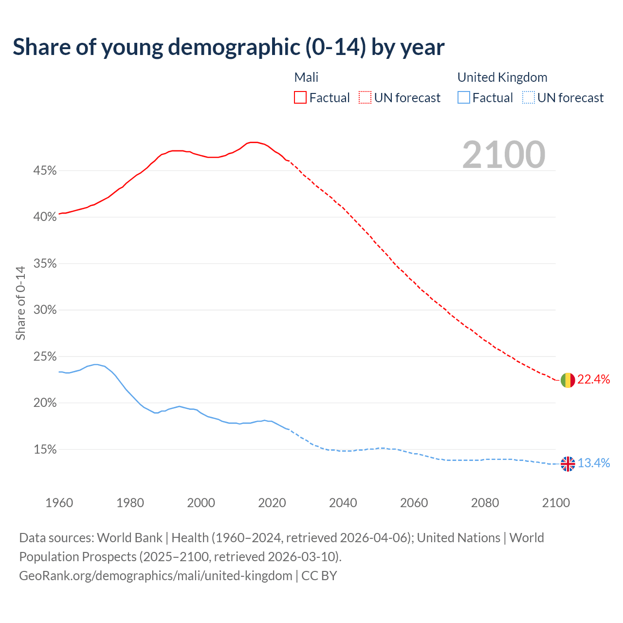 - The share of young demographic (0-15 years old) in Mali is 46.1% vs 17.2% in the United Kingdom.