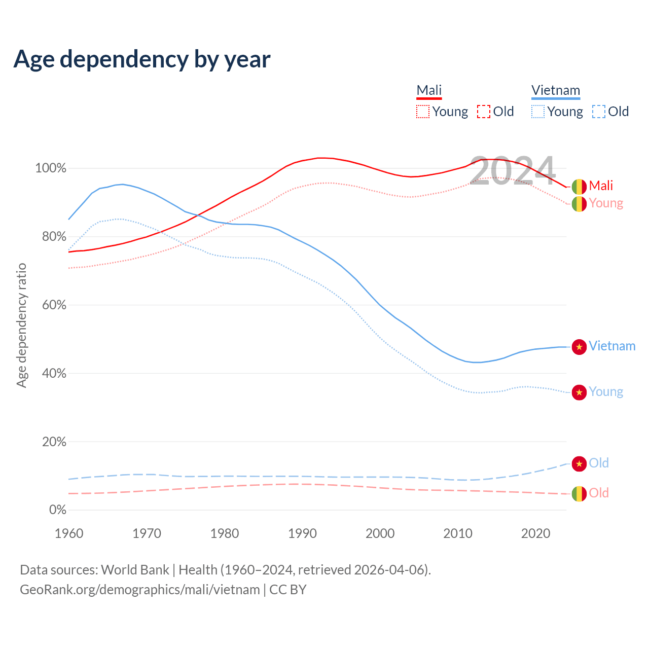 - Mali is ranked 193/196 by median age (oldest to youngest) vs 84/196 for Vietnam.