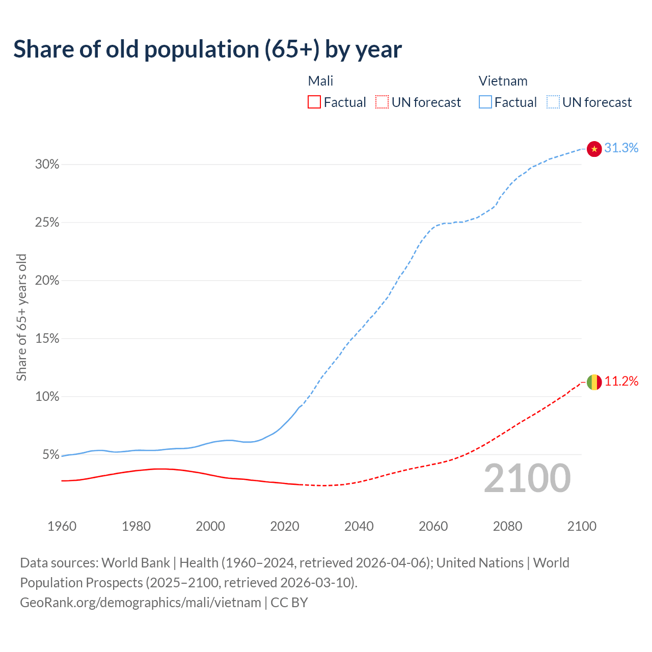 The share of older people aged 65 and over is 2.38% in Mali and 9.05% in Vietnam. Life expectancy in Mali compared to Vietnam .