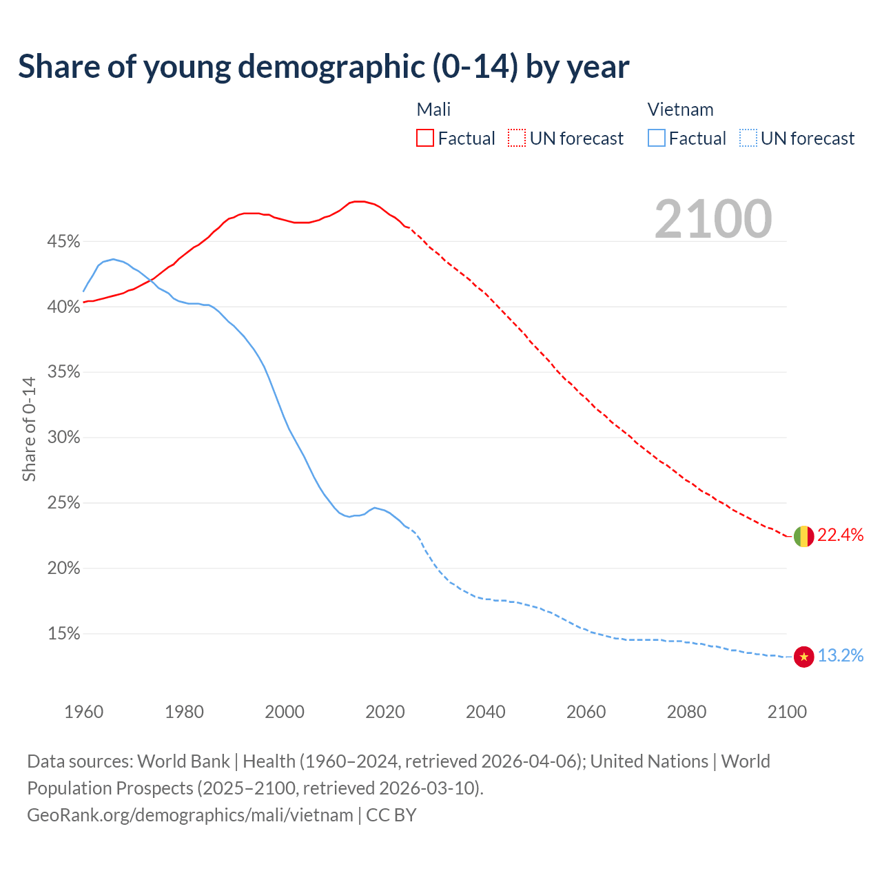 - The share of young demographic (0-15 years old) in Mali is 46.1% vs 23.2% in Vietnam.