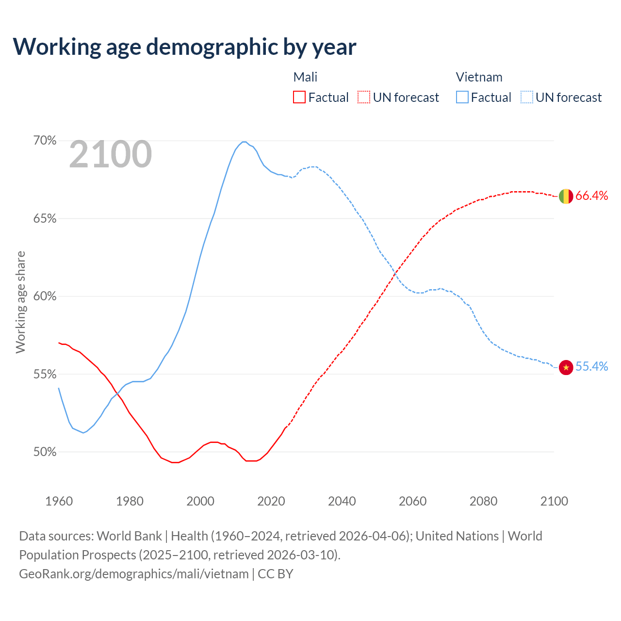 - Mali has 13.5M working age adults (aged 15-64) vs 69.3M in Vietnam.