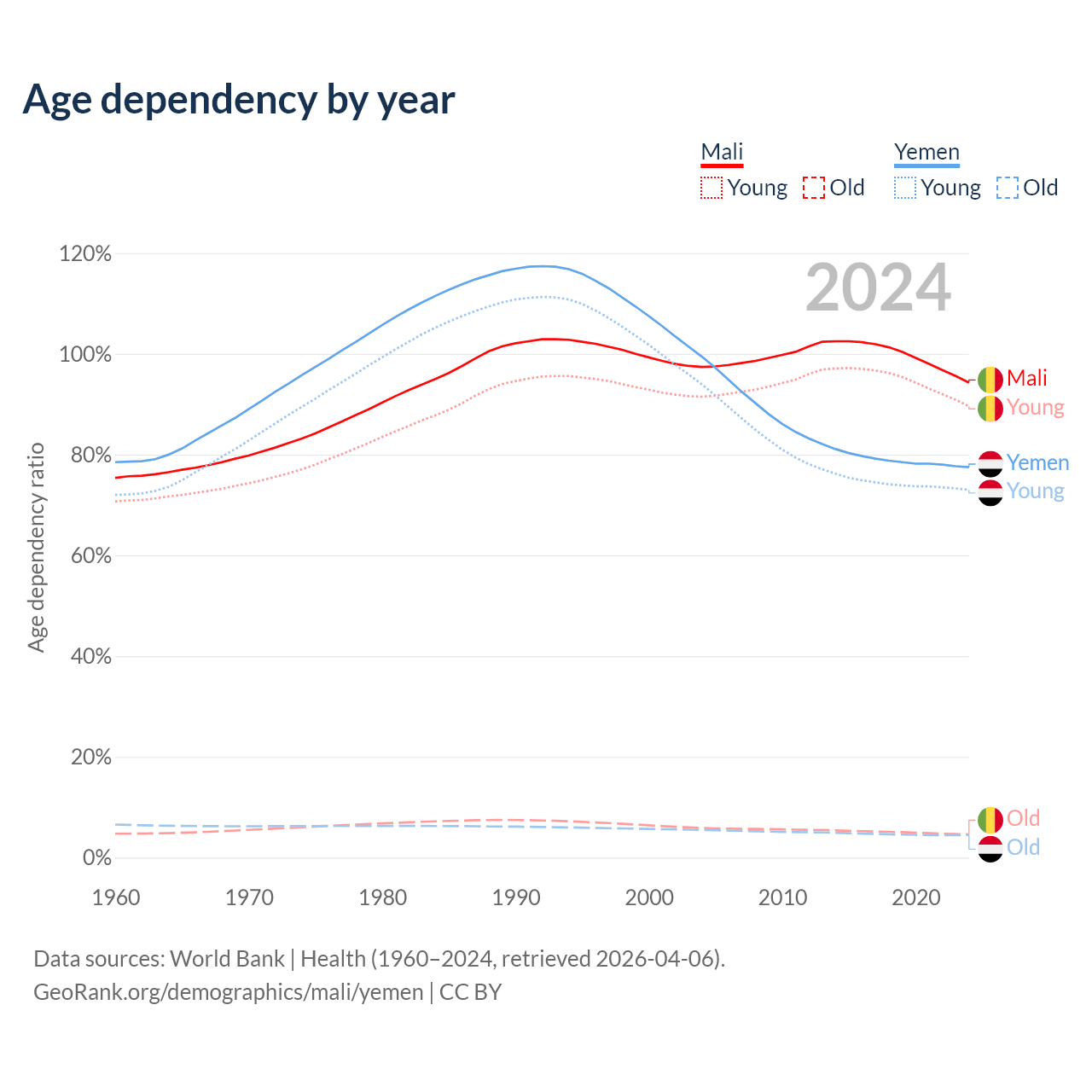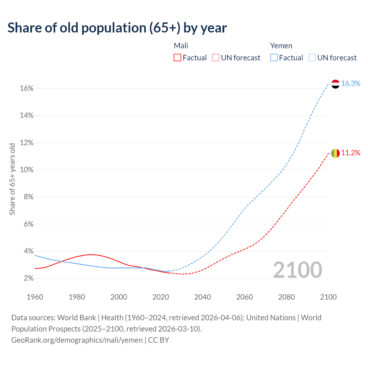 - The share of old-age demographic (65+) in Mali is 2.38% vs 2.52% in Yemen.