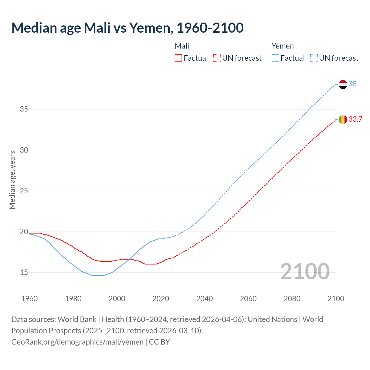 - The median age in Mali is 16.7 years compared to 19.3 years in Yemen.