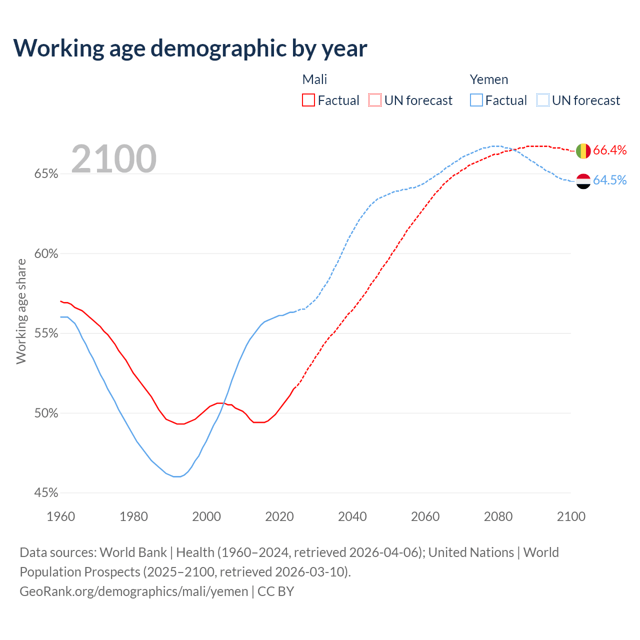 - Mali has 13.5M working age adults (aged 15-64) vs 24.4M in Yemen.