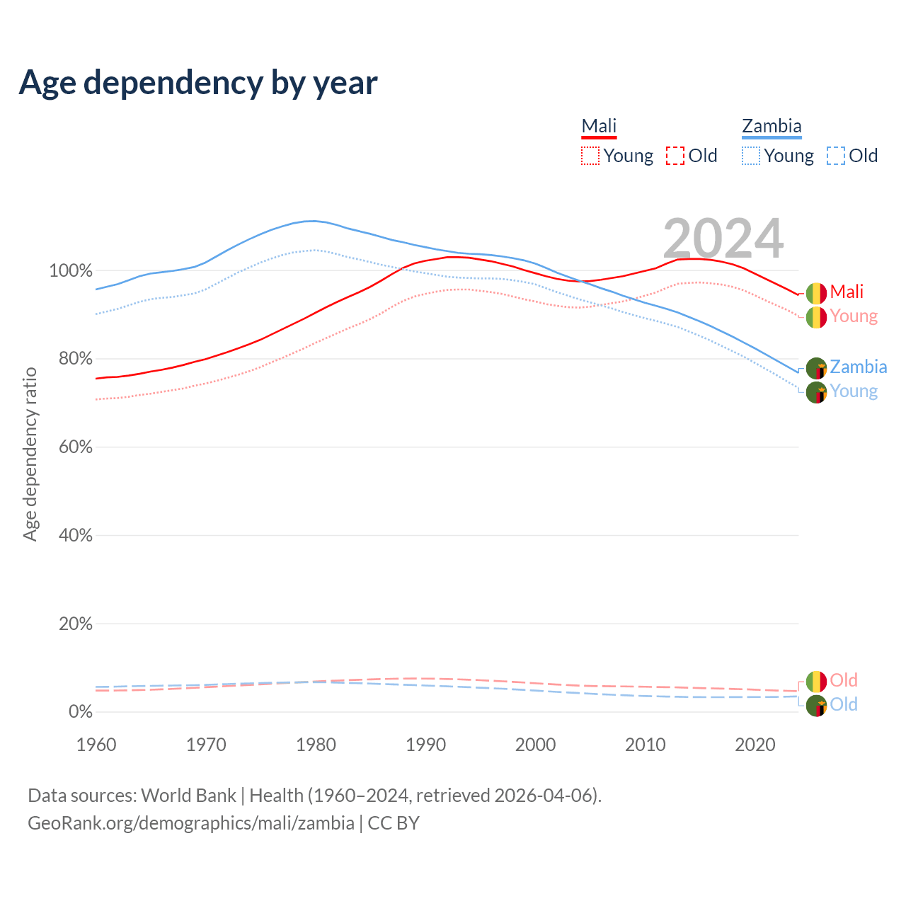 - Mali is ranked 193/196 by median age (oldest to youngest) vs 182/196 for Zambia.