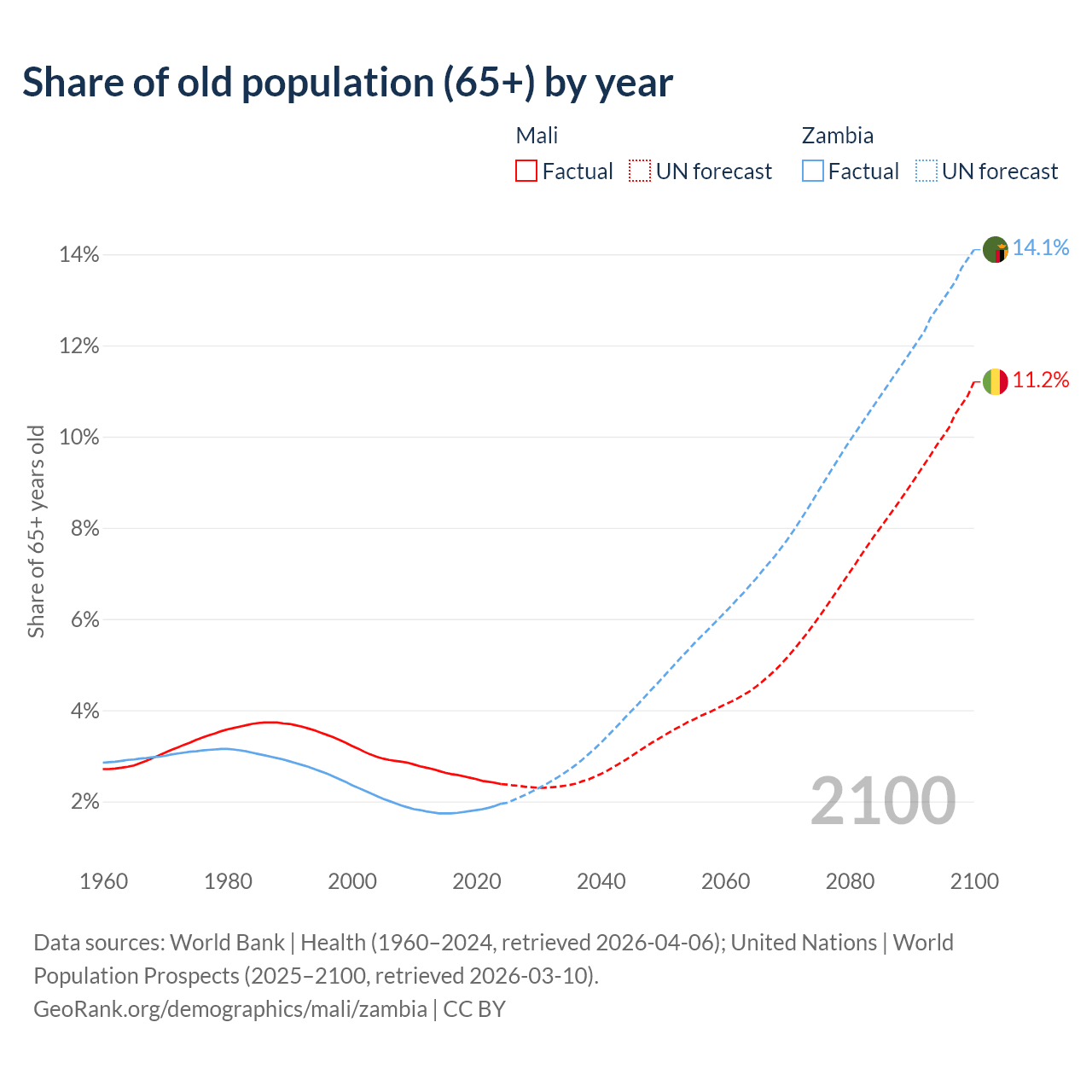 - The share of old-age demographic (65+) in Mali is 2.38% vs 1.95% in Zambia.