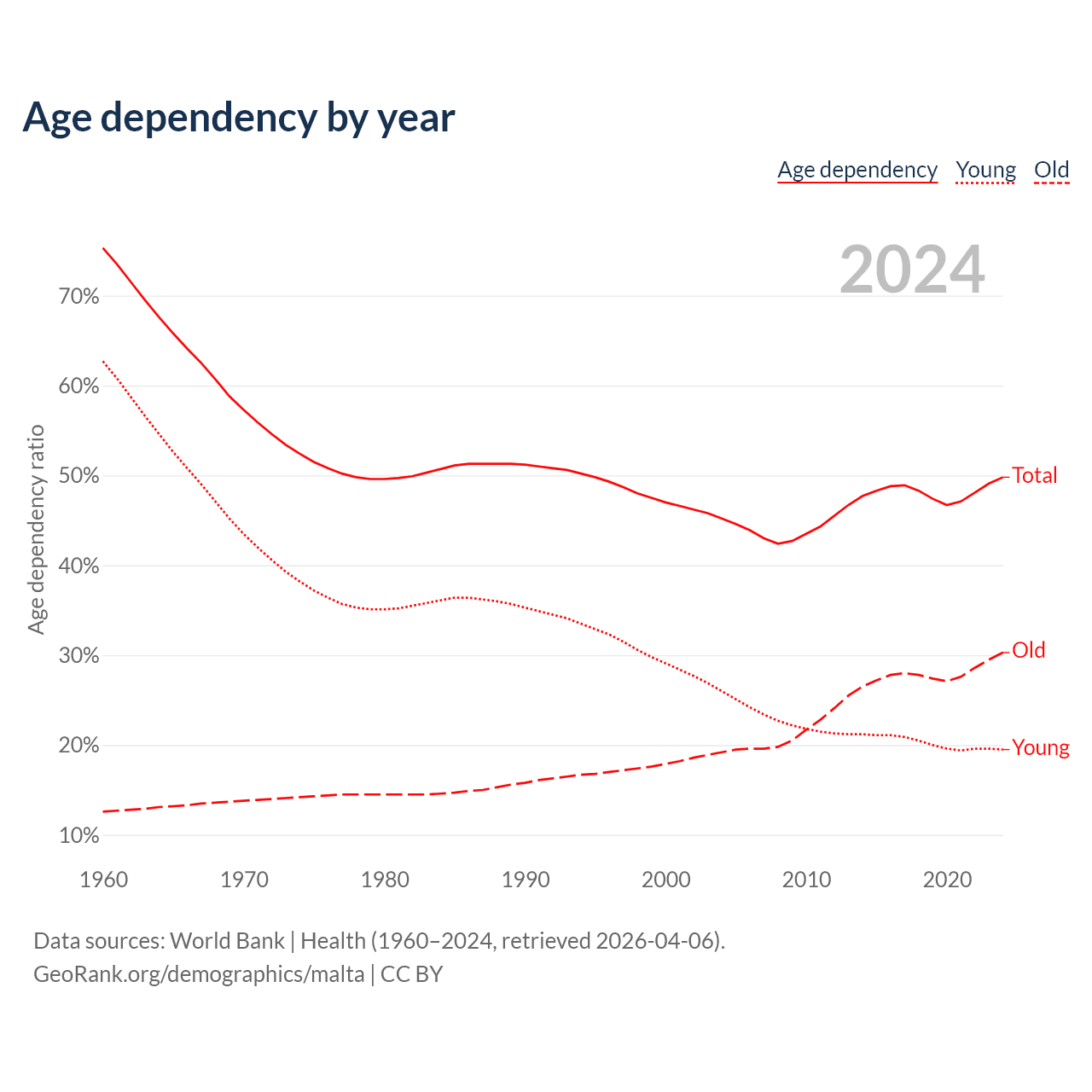 Data sources: World Bank | Health (1960–2024, retrieved 2026-04-06); U.S. Census Bureau (1960–2024, retrieved 2026-02-08).