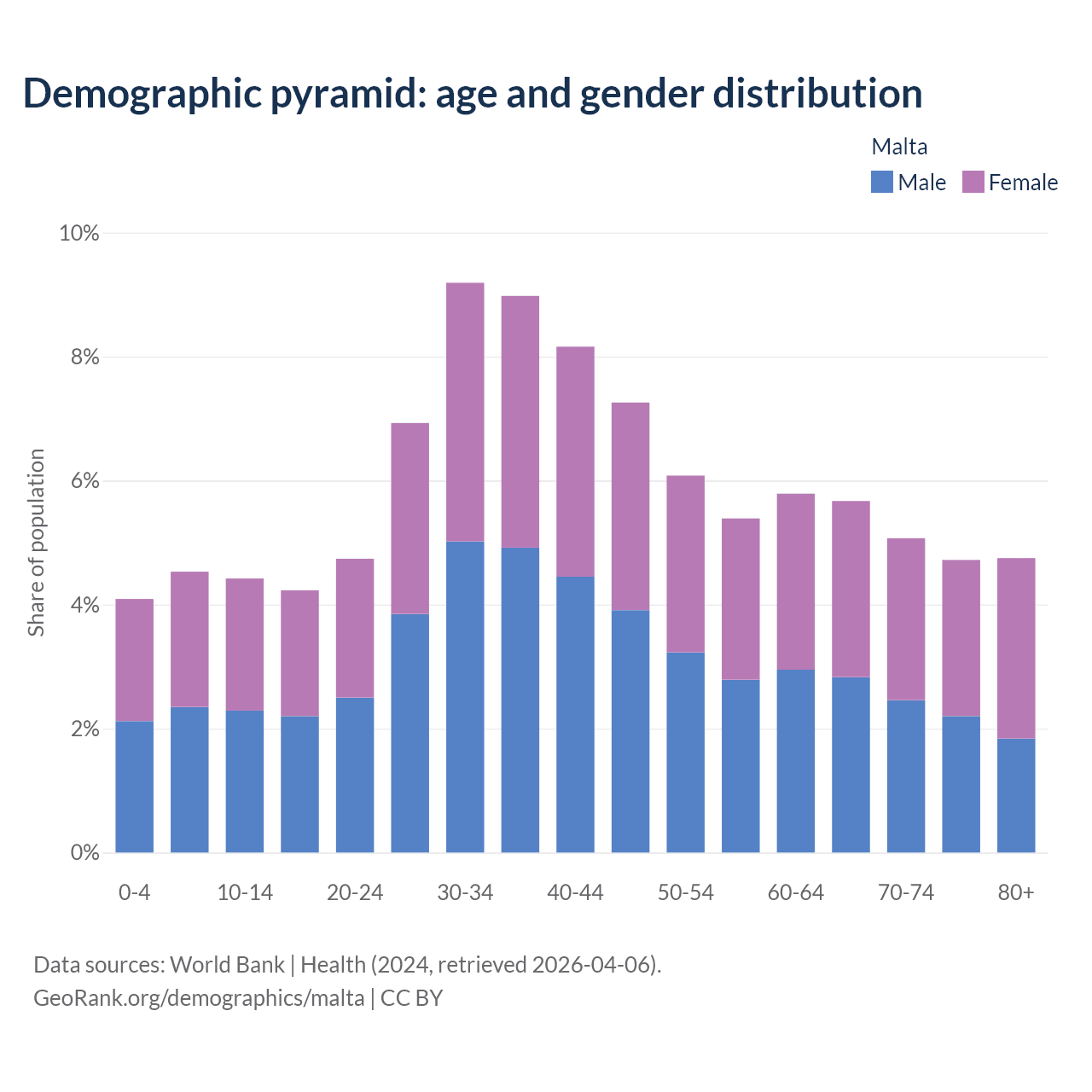 With a population of 569K people, Malta has a median age of 41.8 years which makes it the 36/196 oldest country. 13% of the demographic are children 0-14 years old, 66.8% are working-age people aged 15-64, and 20.2% are older population aged 65+ years.