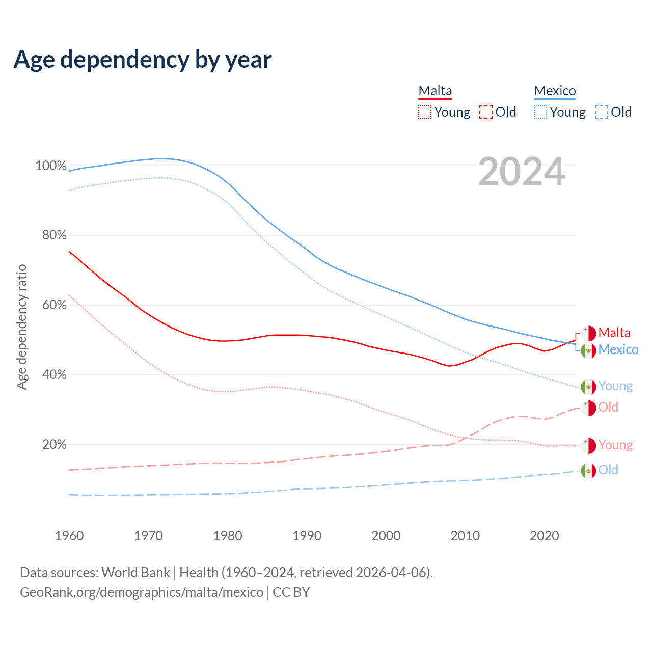 Data sources: World Bank | Health (1960–2024, retrieved 2026-04-06); U.S. Census Bureau (1960–2024, retrieved 2026-02-08).
