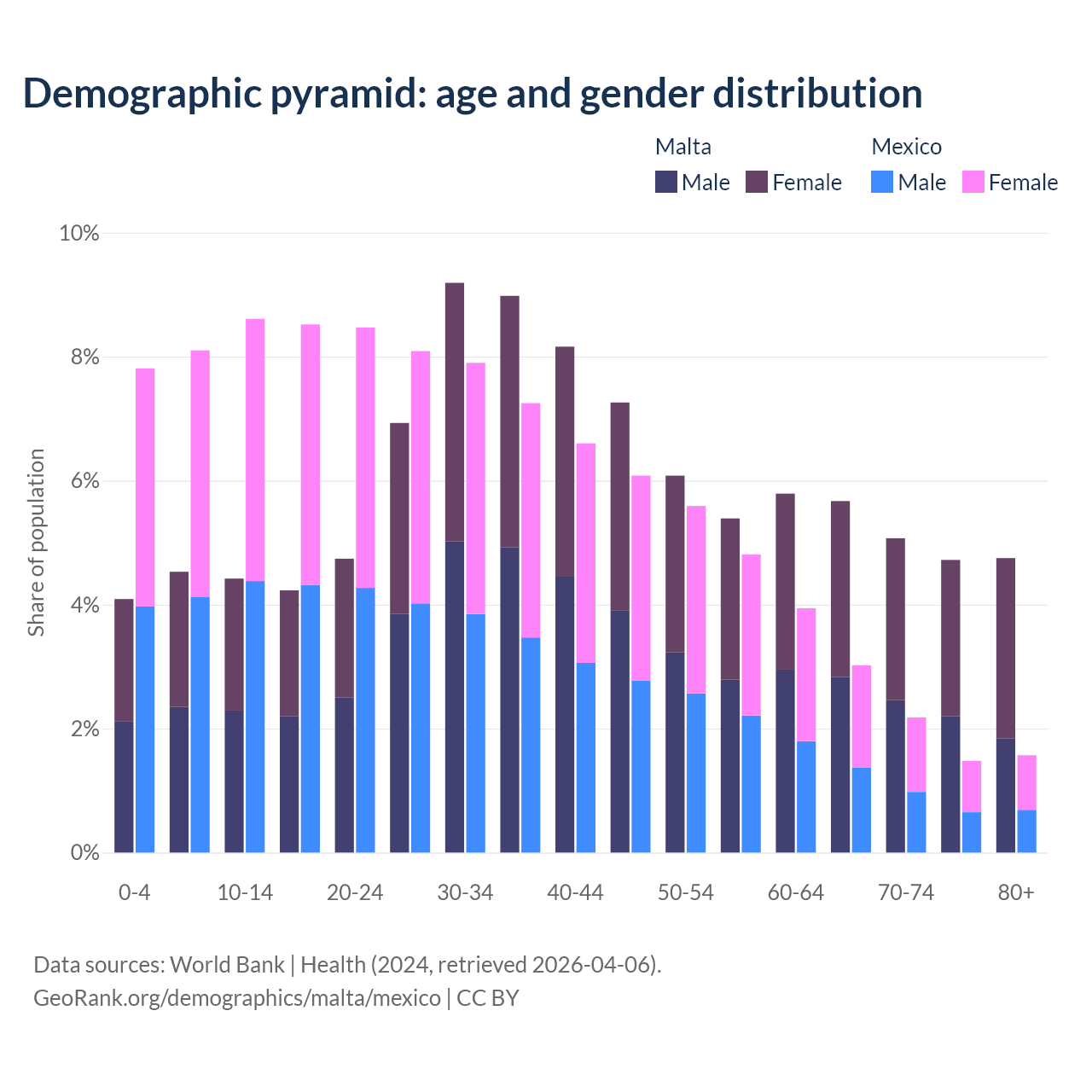 - Malta is ranked 36/196 by median age (oldest to youngest) vs 102/196 for Mexico.