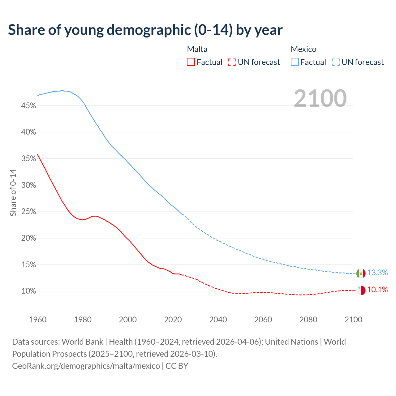 - The share of young demographic (0-15 years old) in Malta is 13% vs 24.5% in Mexico.