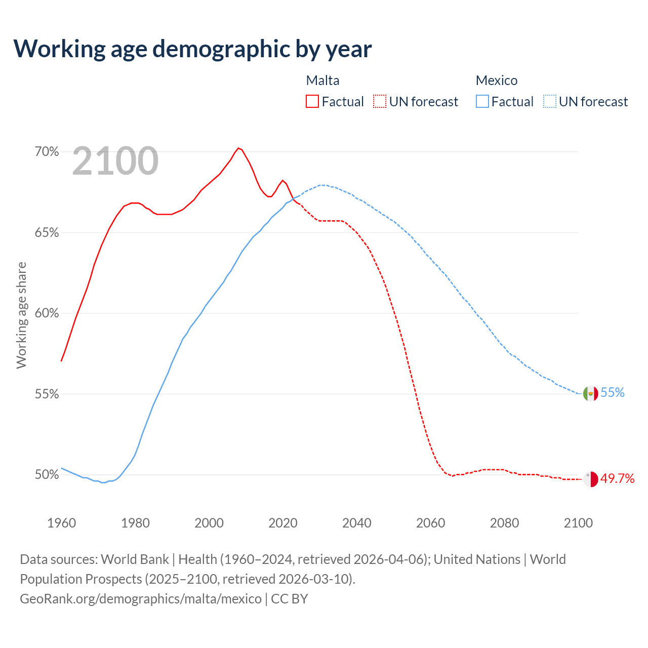 Median age Malta vs Mexico, 1960-2100