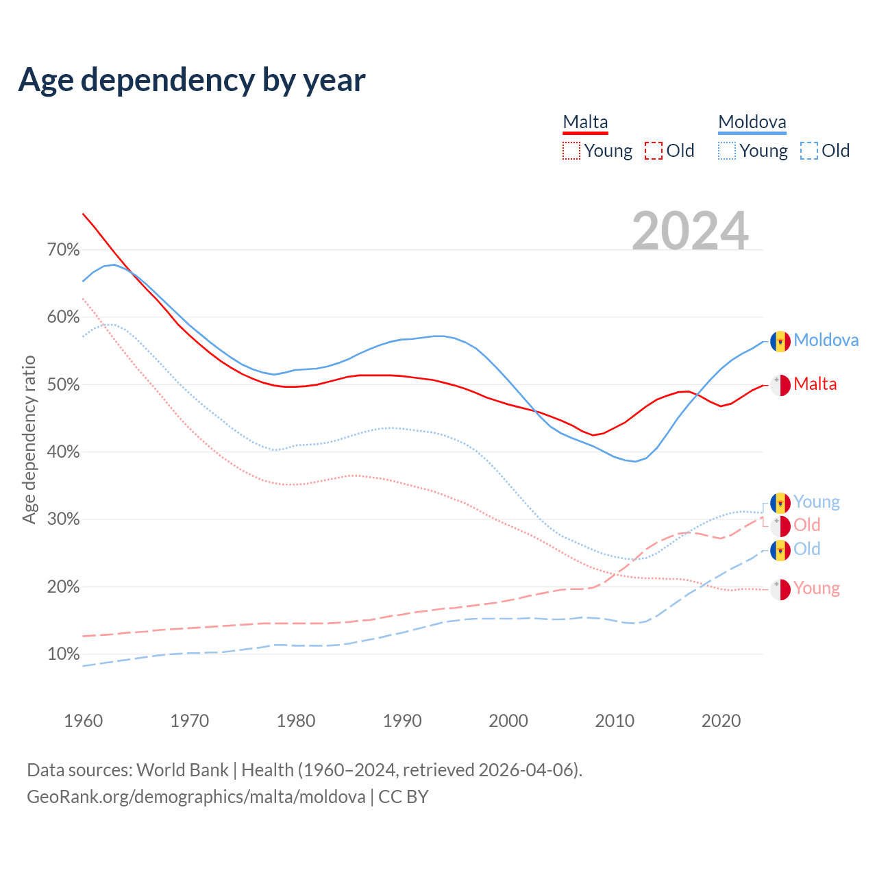 - The share of old-age demographic (65+) in Malta is 20.2% vs 16.2% in Moldova.