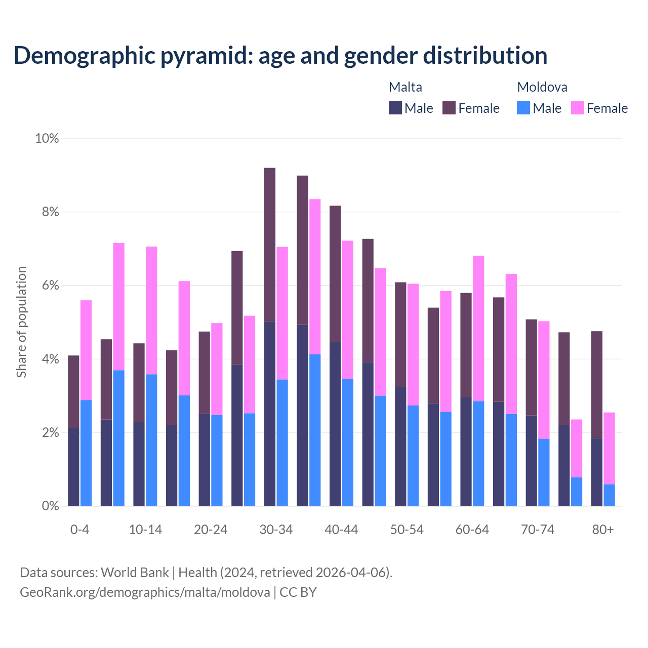 - Malta is ranked 36/196 by median age (oldest to youngest) vs 54/196 for Moldova.
