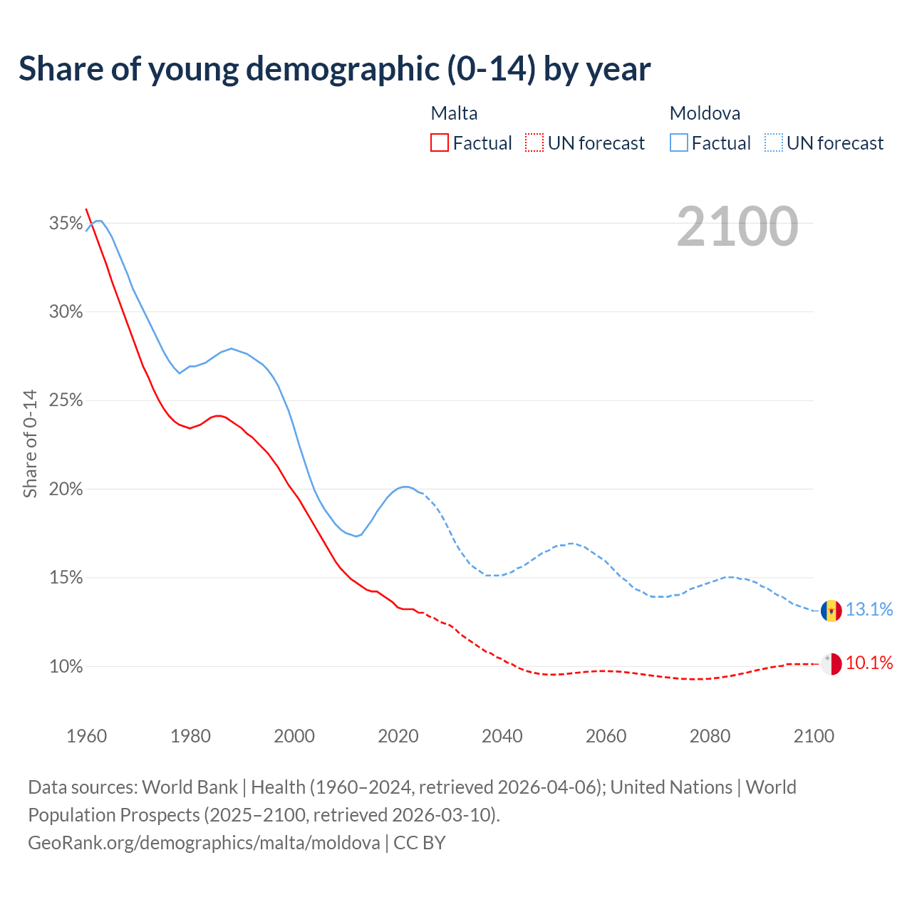 - The share of young demographic (0-15 years old) in Malta is 13% vs 19.8% in Moldova.