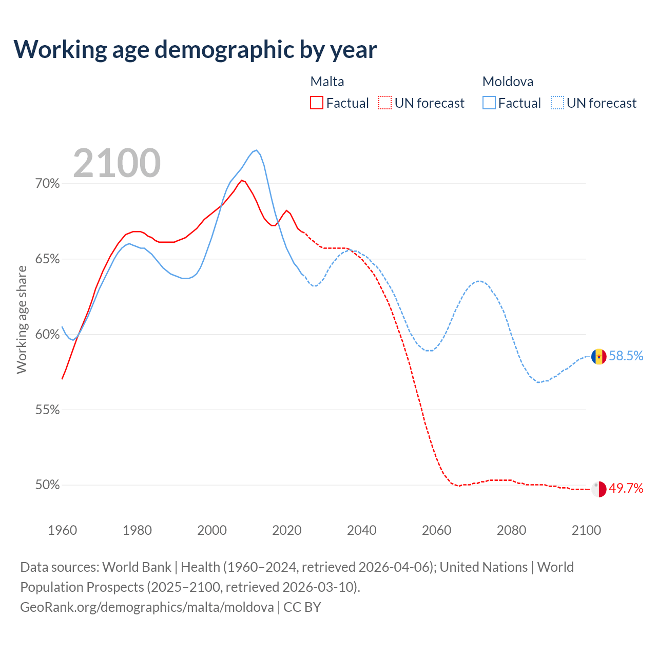 - Malta has 388K working age adults (aged 15-64) vs 1.5M in Moldova.