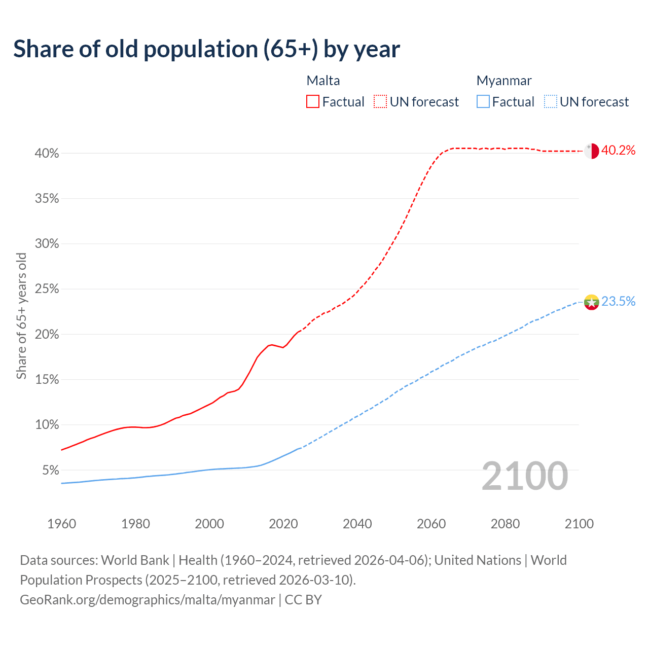 - The share of old-age demographic (65+) in Malta is 20.2% vs 7.3% in Myanmar.