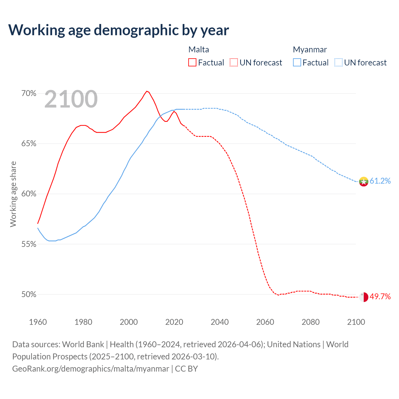- Malta has 388K working age adults (aged 15-64) vs 37.8M in Myanmar.