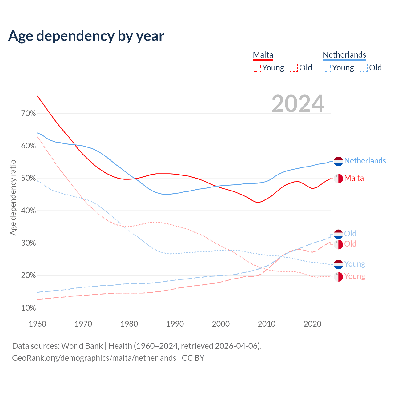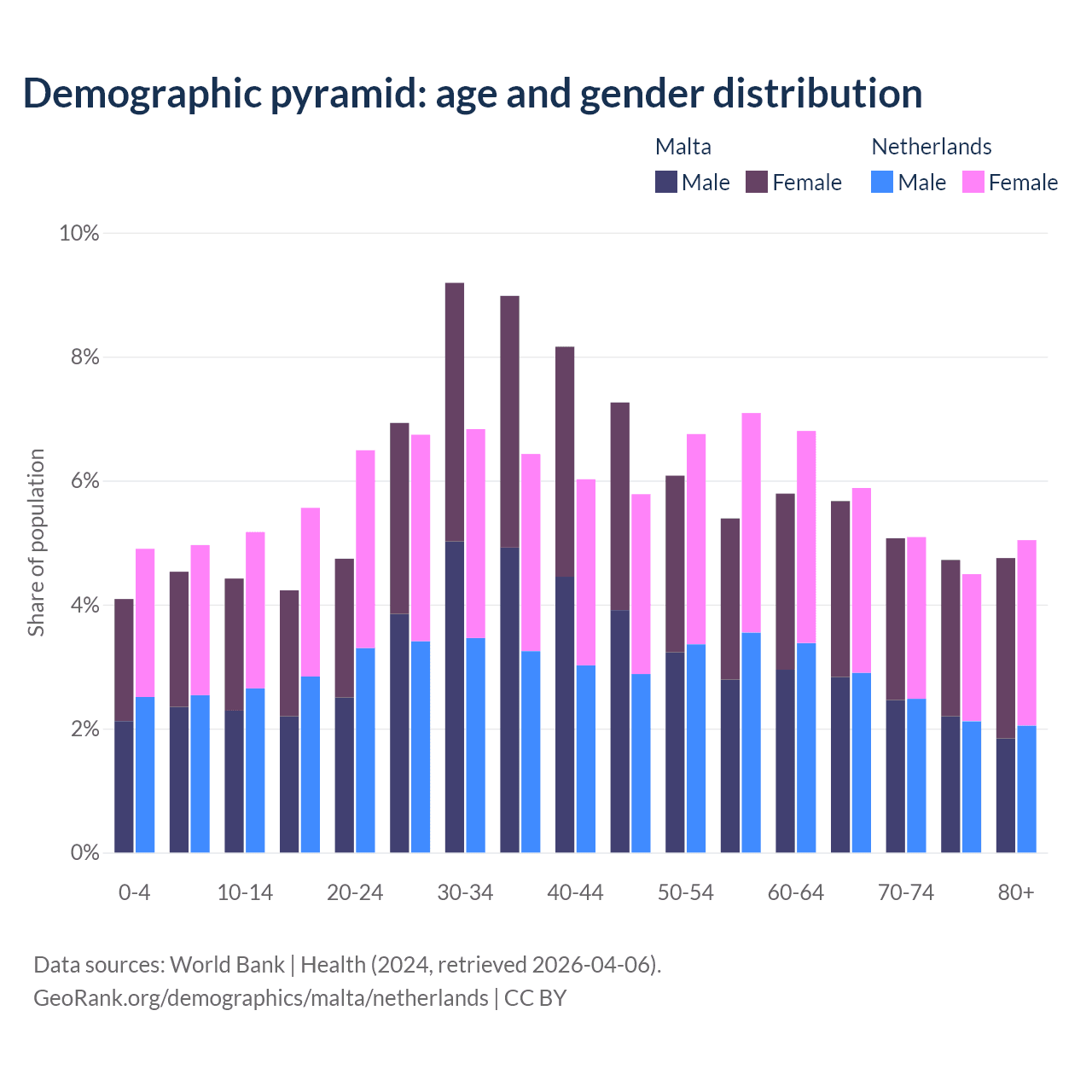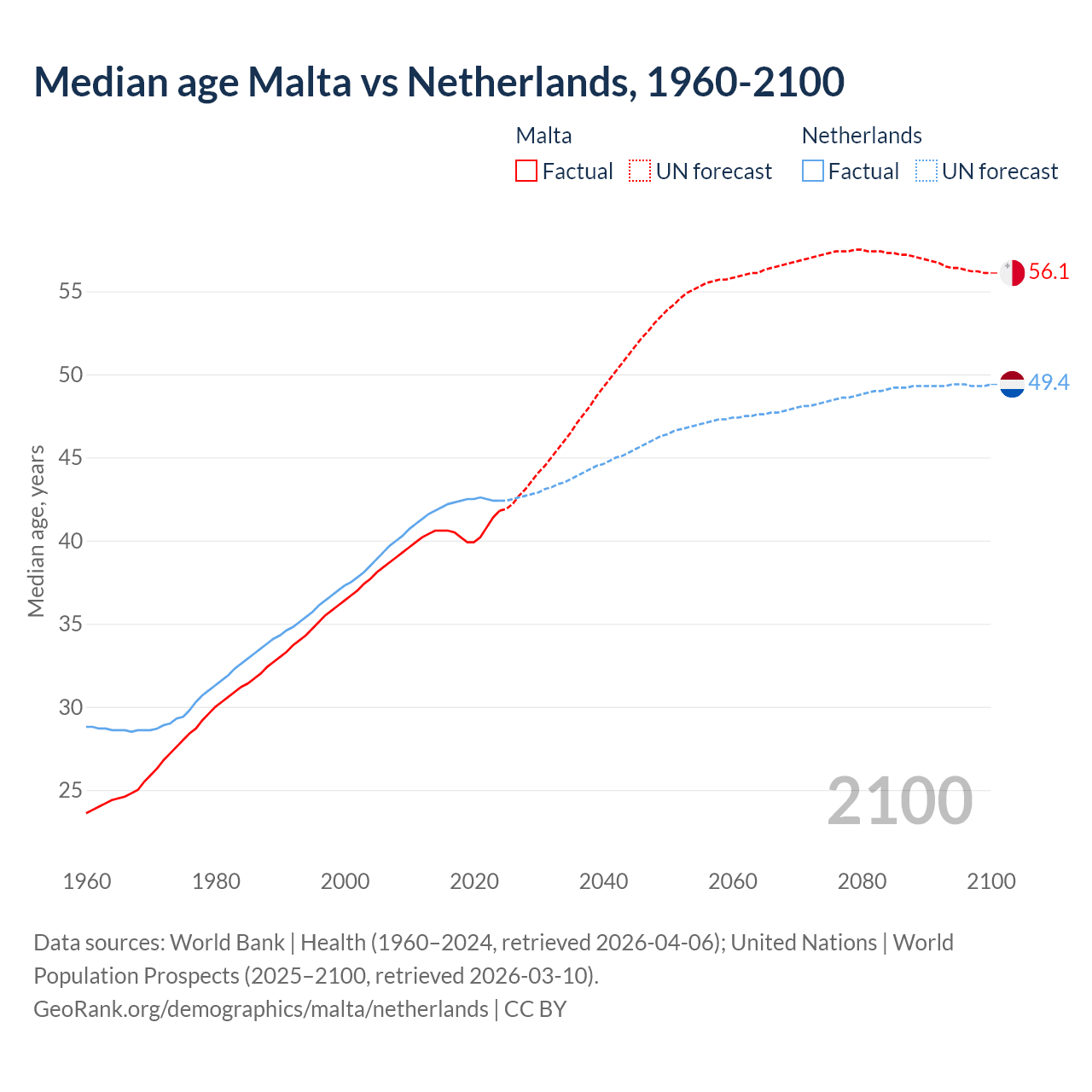 - Malta is ranked 36/196 by median age (oldest to youngest) vs 33/196 for the Netherlands.