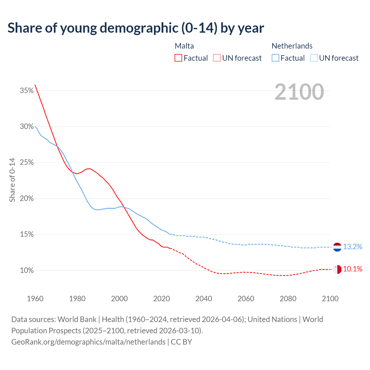 - The share of young demographic (0-15 years old) in Malta is 13% vs 15% in the Netherlands.
