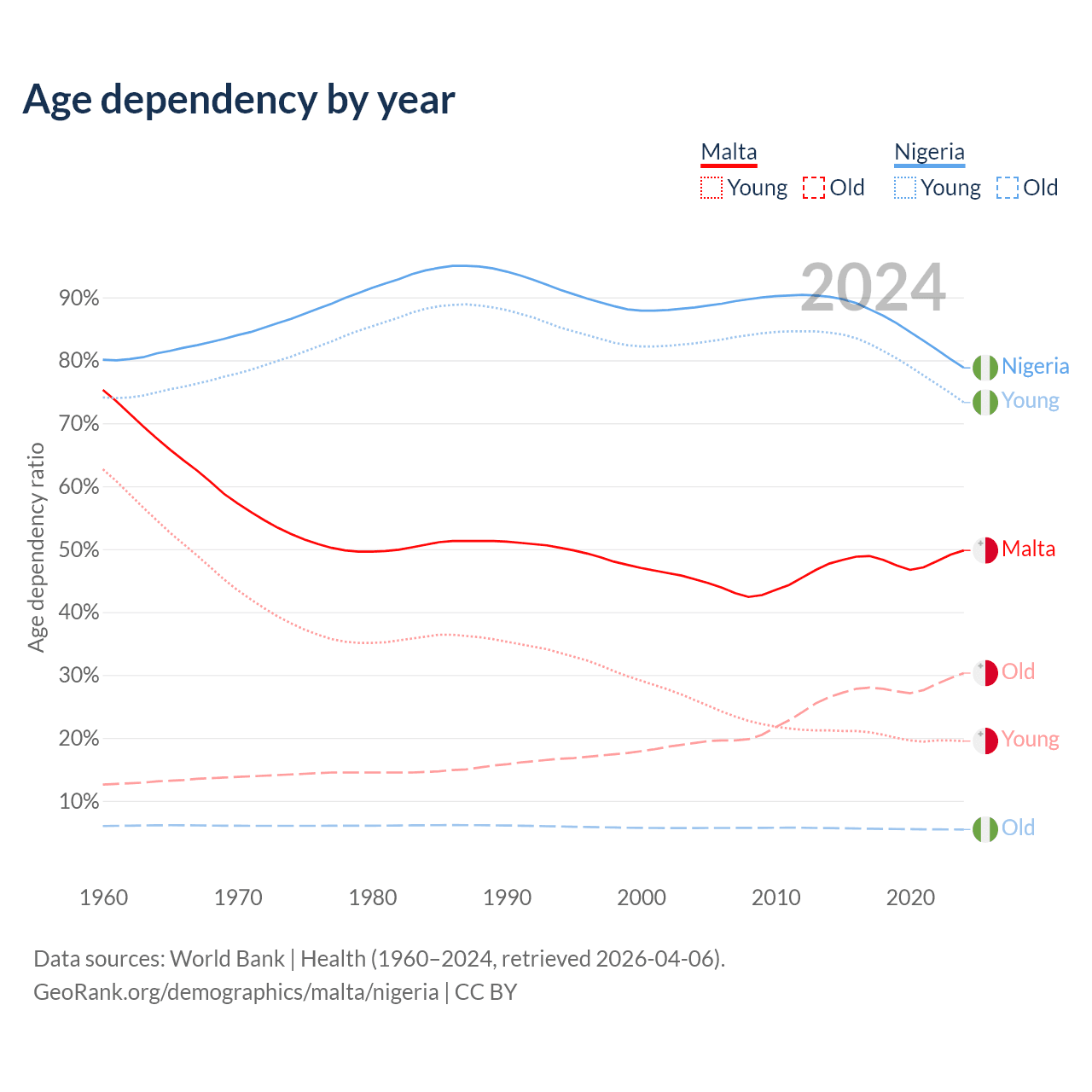 - The share of old-age demographic (65+) in Malta is 20.2% vs 3.05% in Nigeria.