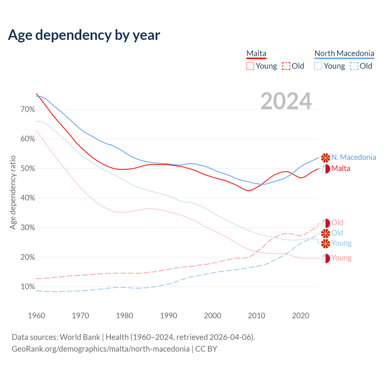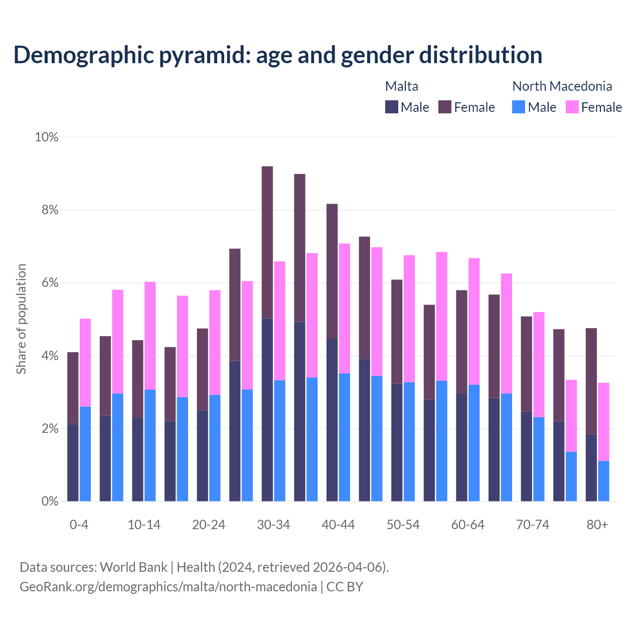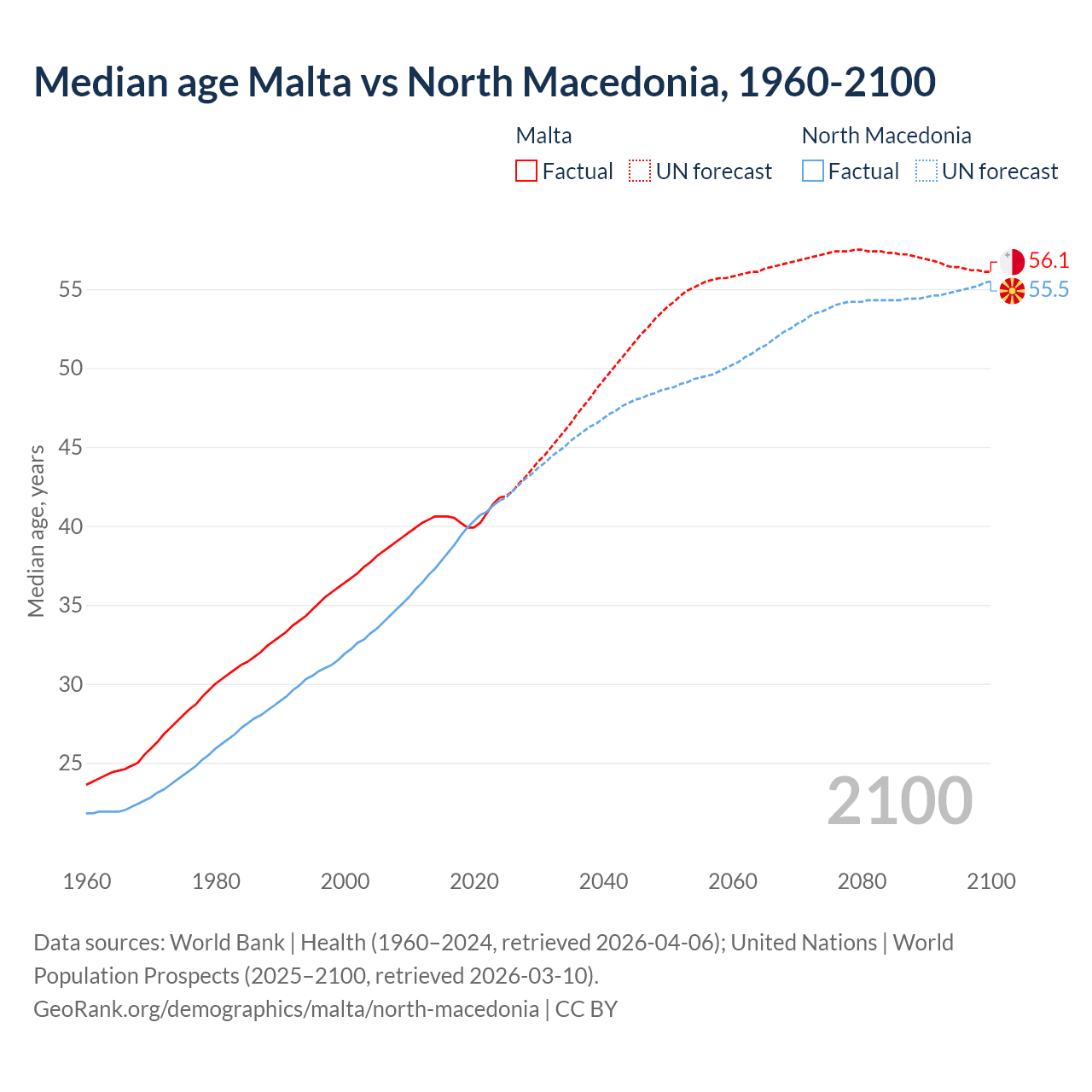 - Malta is ranked 36/196 by median age (oldest to youngest) vs 37/196 for North Macedonia.