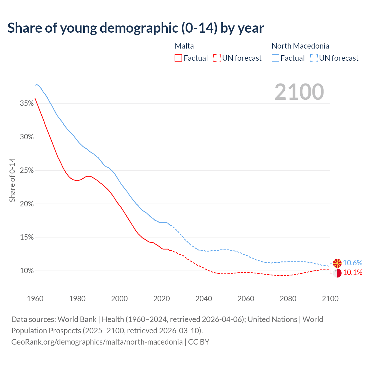- The share of young demographic (0-15 years old) in Malta is 13% vs 16.8% in North Macedonia.