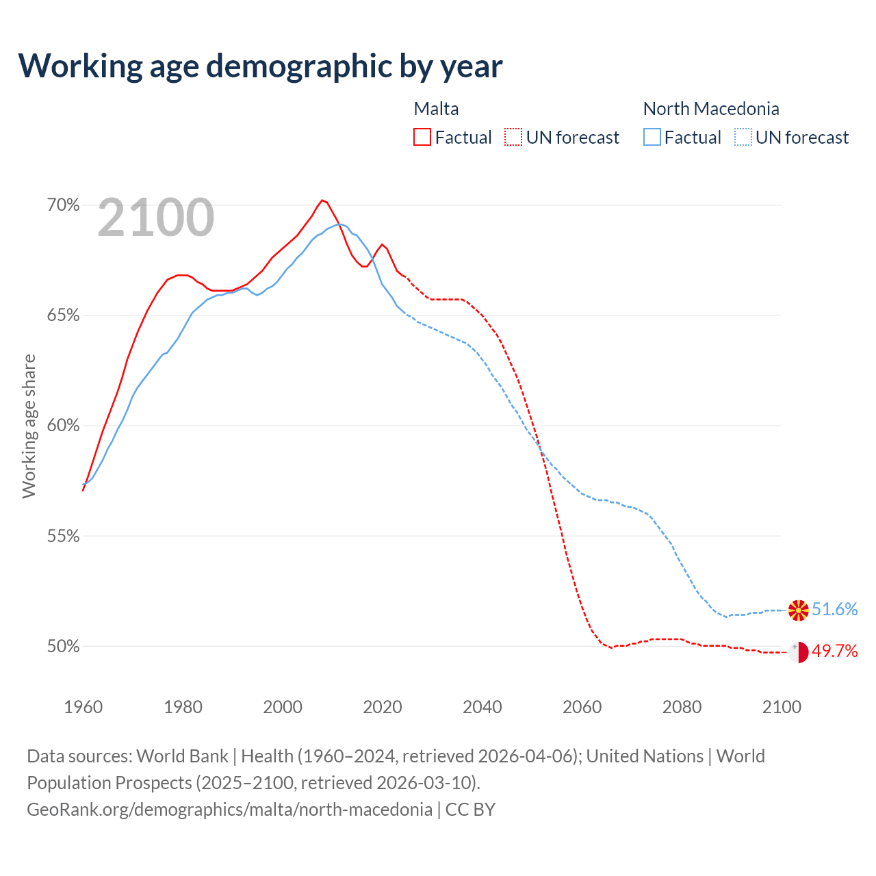 - Malta has 388K working age adults (aged 15-64) vs 1.18M in North Macedonia.