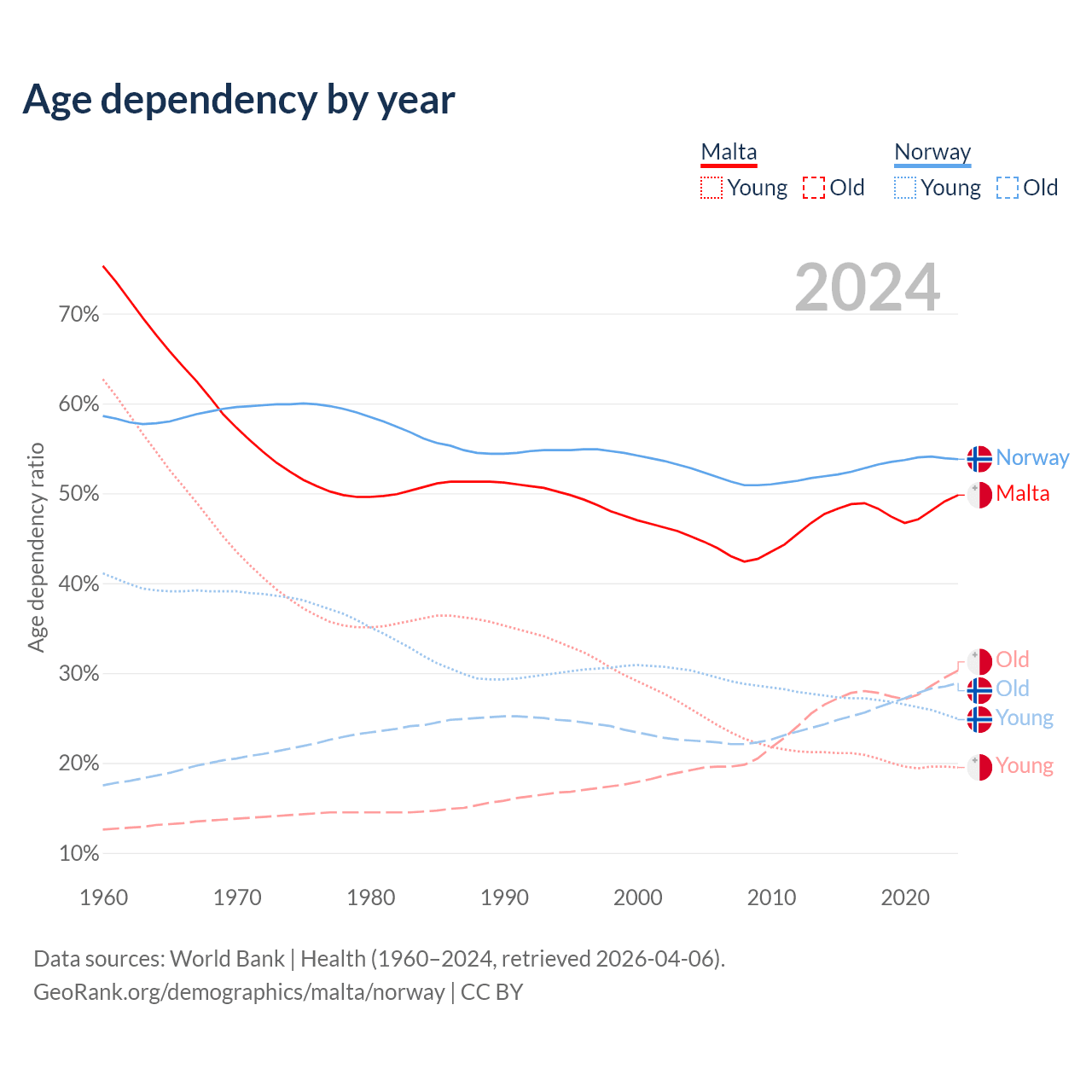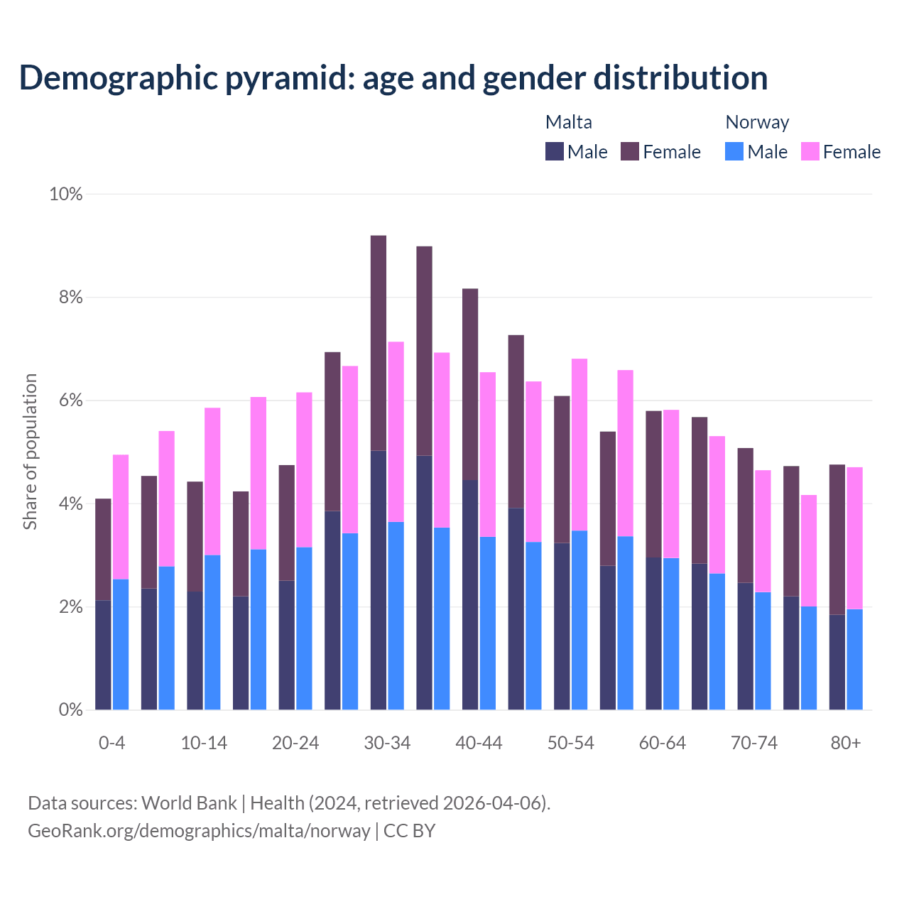 - Malta is ranked 36/196 by median age (oldest to youngest) vs 43/196 for Norway.