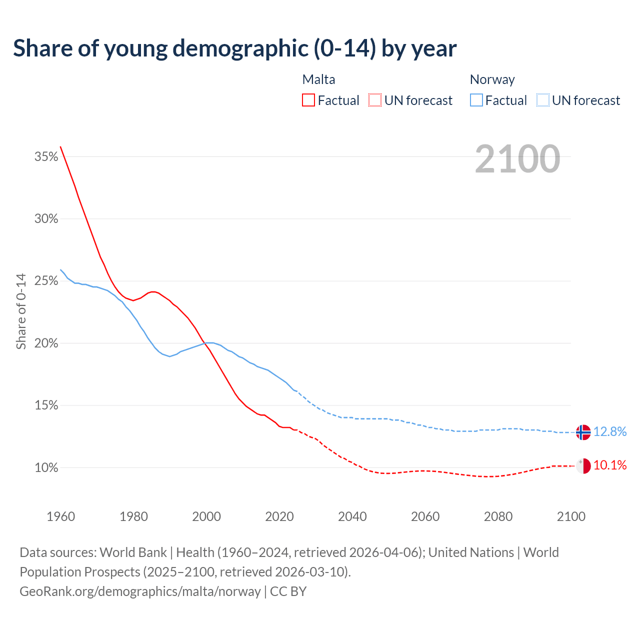 - The share of young demographic (0-15 years old) in Malta is 13% vs 16.2% in Norway.