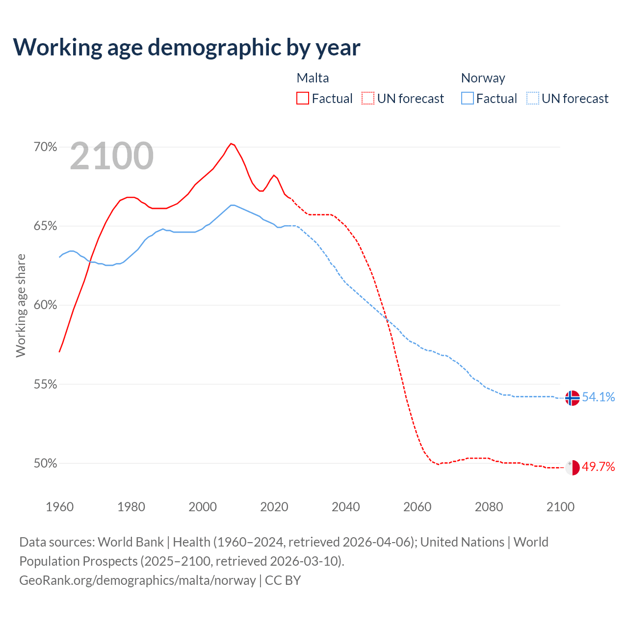 - Malta has 388K working age adults (aged 15-64) vs 3.69M in Norway.