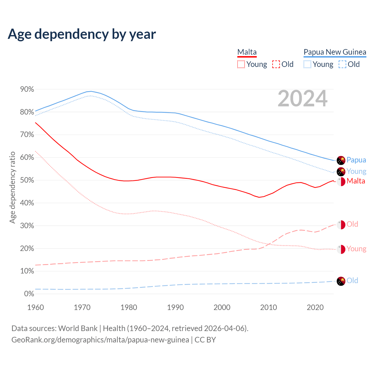 - The share of old-age demographic (65+) in Malta is 20.2% vs 3.46% in Papua New Guinea.