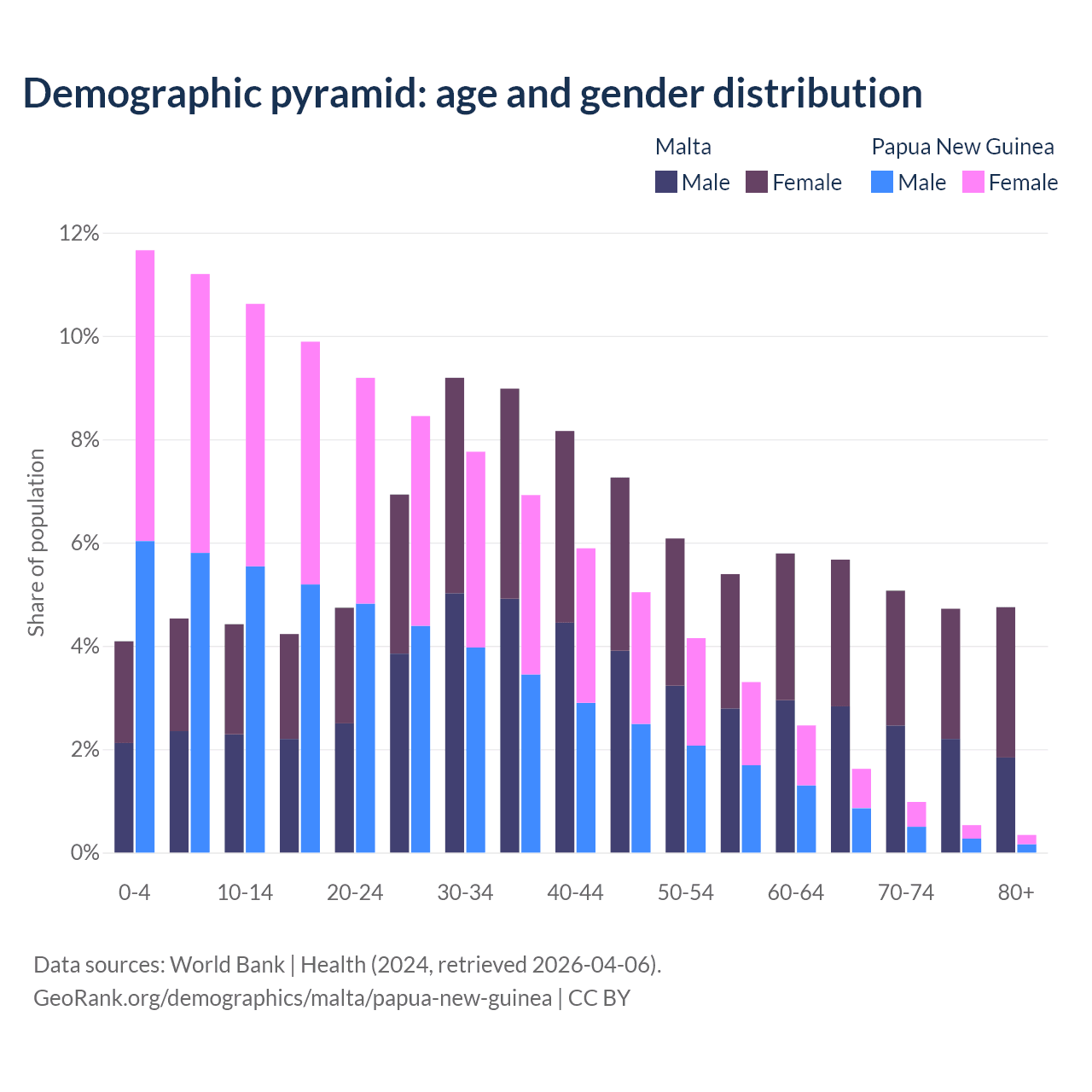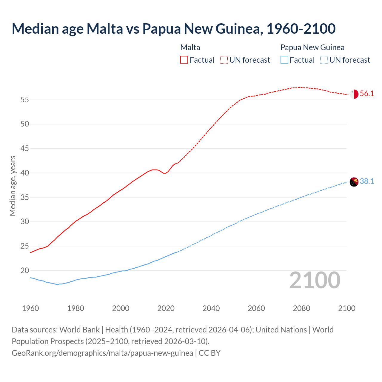 - Malta is ranked 36/196 by median age (oldest to youngest) vs 140/196 for Papua New Guinea.