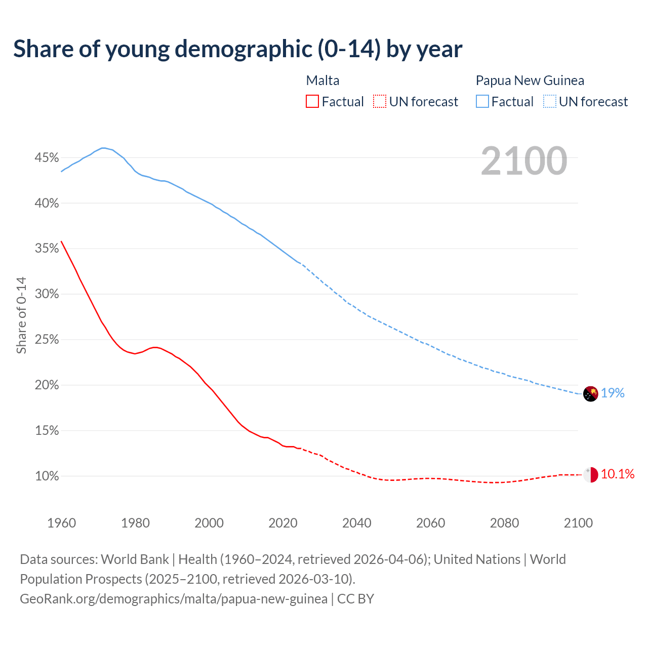 - The share of young demographic (0-15 years old) in Malta is 13% vs 33.5% in Papua New Guinea.