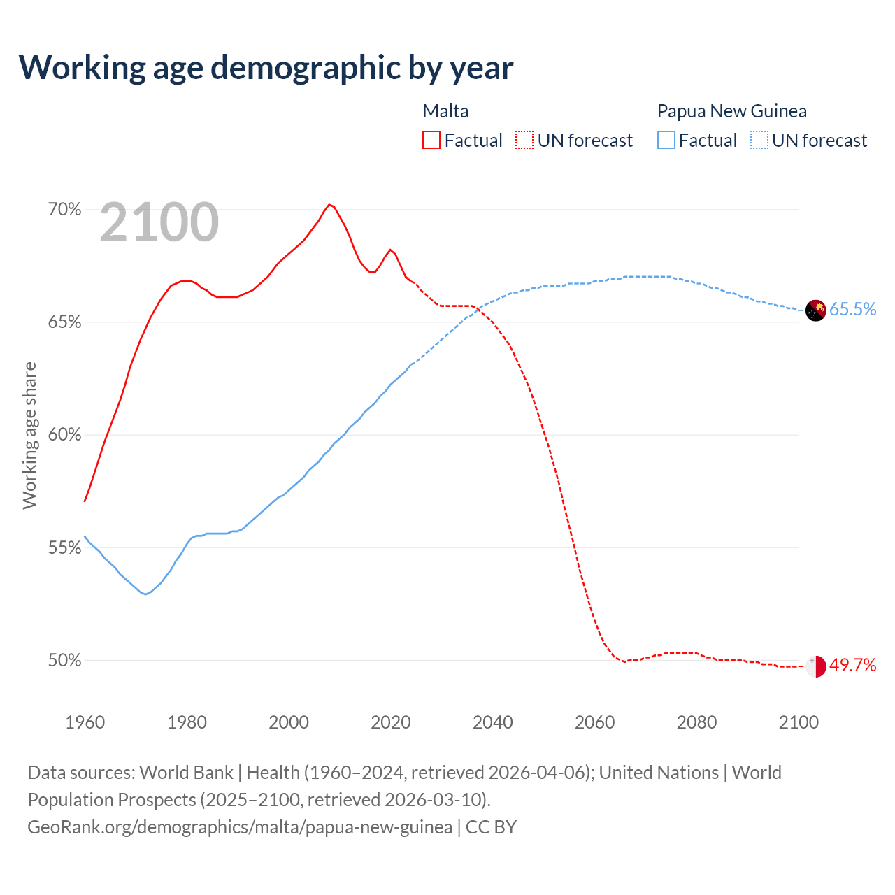 - Malta has 388K working age adults (aged 15-64) vs 6.94M in Papua New Guinea.