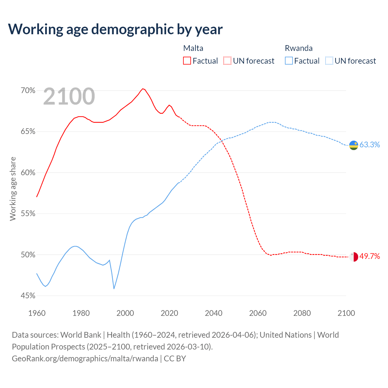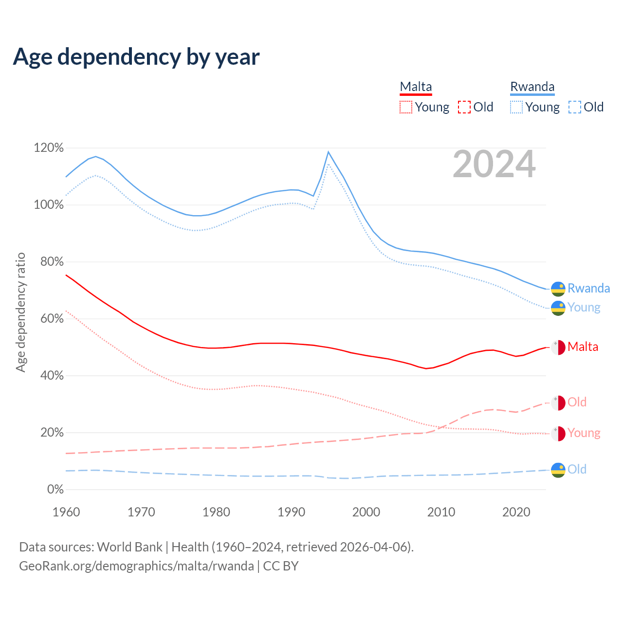 - The share of old-age demographic (65+) in Malta is 20.2% vs 3.93% in Rwanda.