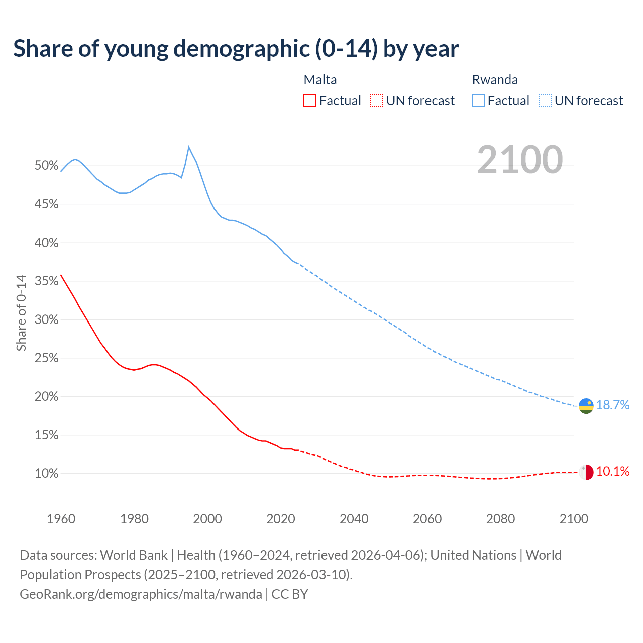 - The share of young demographic (0-15 years old) in Malta is 13% vs 37.4% in Rwanda.