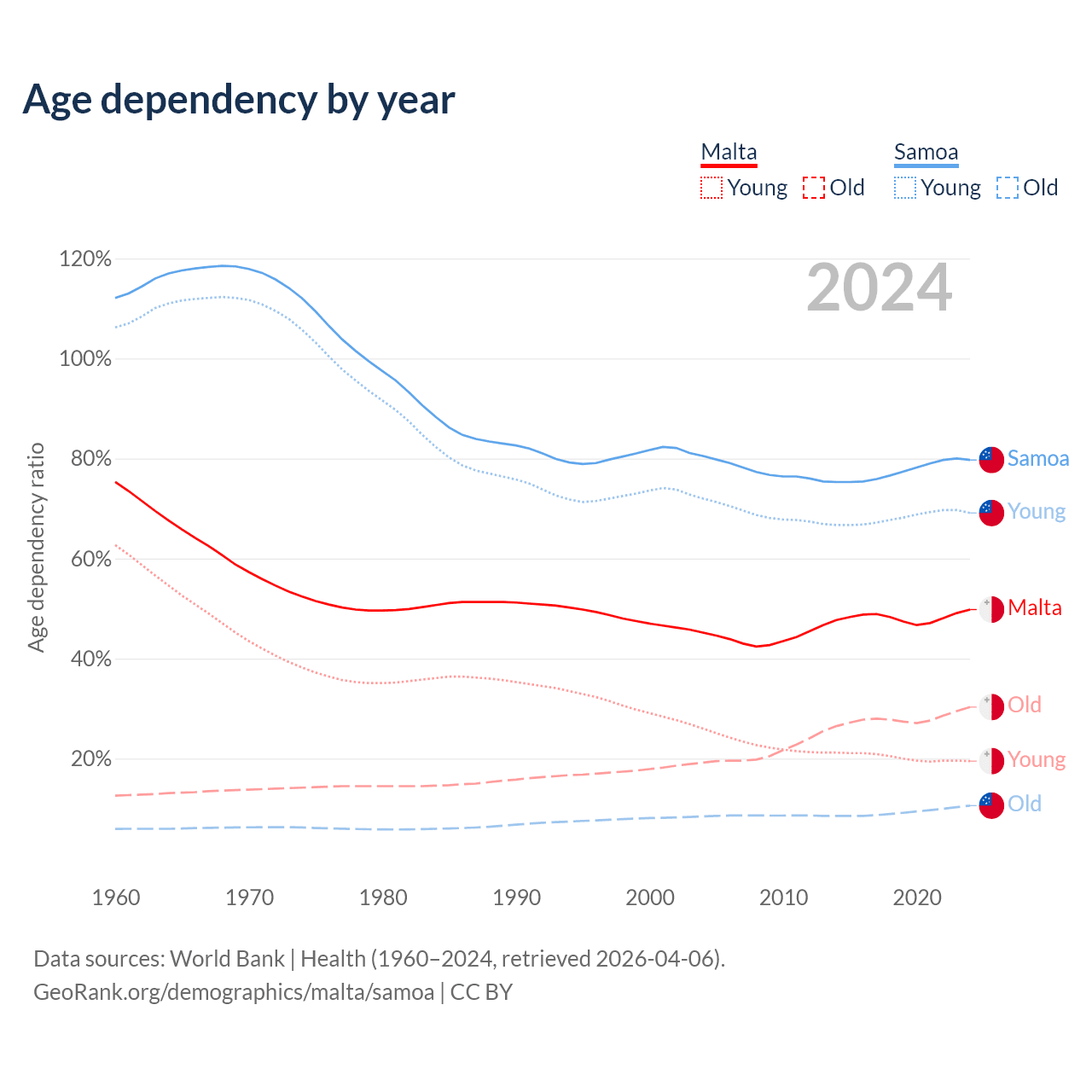 - The share of old-age demographic (65+) in Malta is 20.2% vs 5.88% in Samoa.