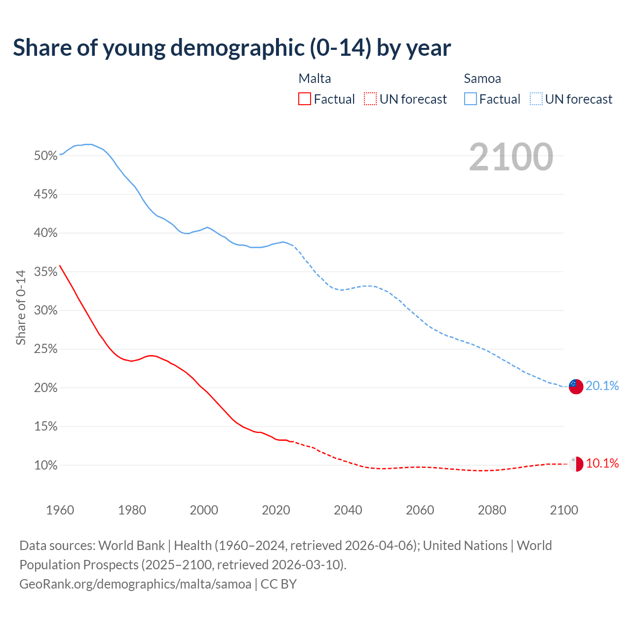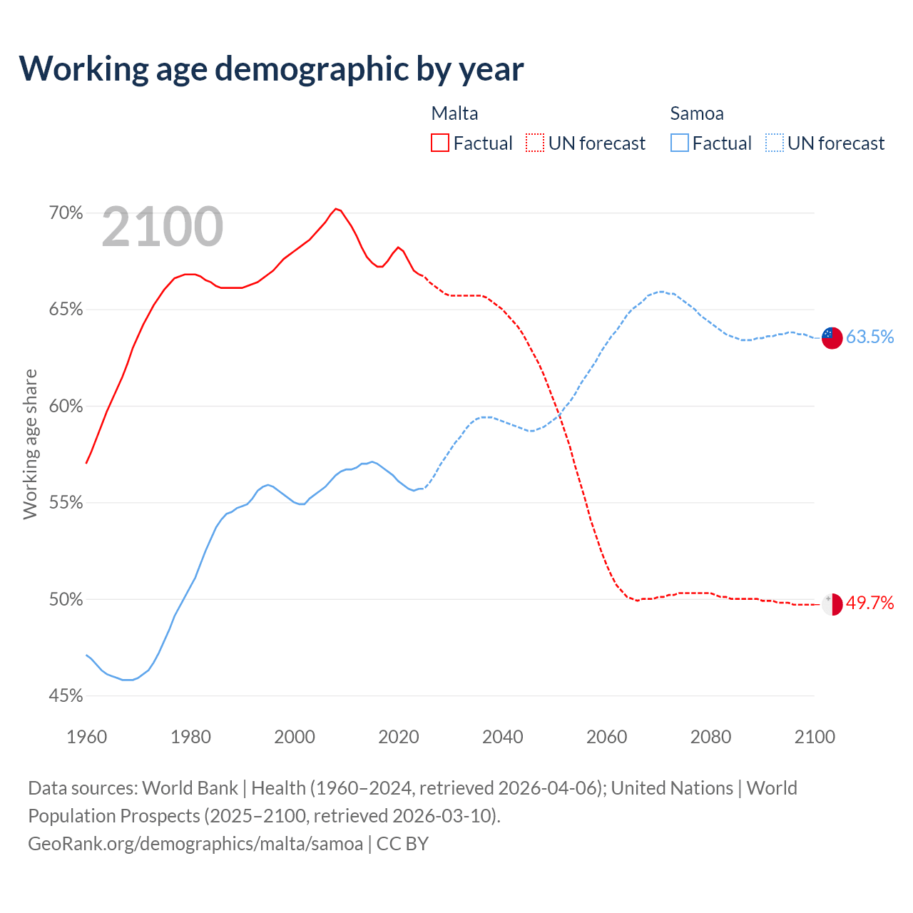Median age Malta vs Samoa, 1960-2100