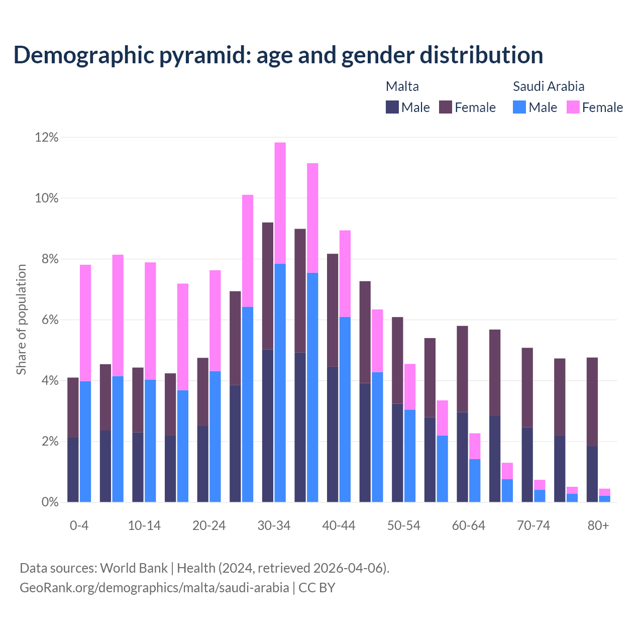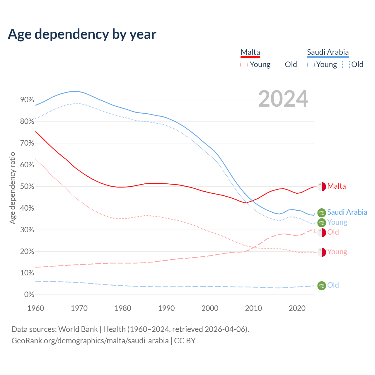 - Malta is ranked 36/196 by median age (oldest to youngest) vs 98/196 for Saudi Arabia.