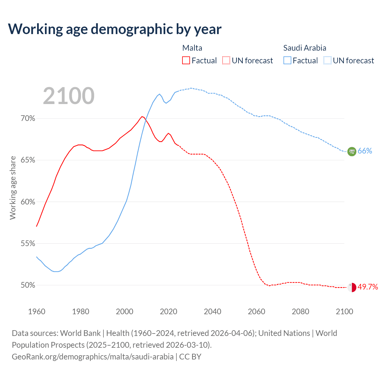 Median age Malta vs Saudi Arabia, 1960-2100