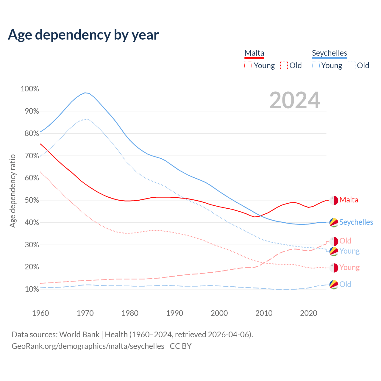 - The share of young demographic (0-15 years old) in Malta is 13% vs 20% in the Seychelles.